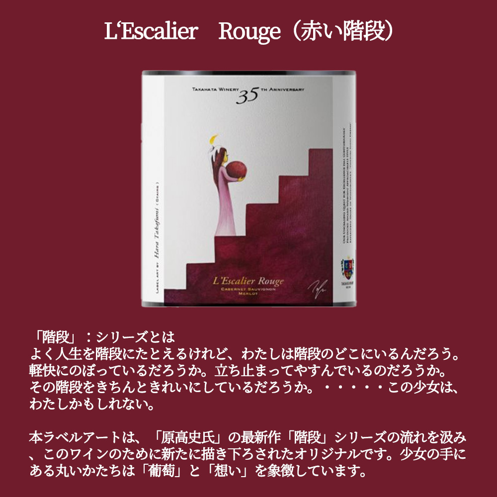 【商品名】レスカリエ・ルージュ(赤い階段)・35周年記念ワイン[2022]年・超限定生産作品・高畠ワイナリー(日本ワイナリーアワード7年連続5つ星選出ワイナリー)元詰・(創業35周年記念ワイン)・(山形県高畠町産黒ブドウ100%使用=カベルネ・ソーヴィニヨン73.7%、メルロー26.3%)・オーク樽100%&24カ月熟成・アルコール度数14%・年産(全生産本数)わずか1000本のみ・日本ワイン・赤・フルボディ・辛口【英名】L'Escalier Rouge 2022 TAKAHATA WINERY Special Edition 35th Anniversary Wine Limited 1000Bt
