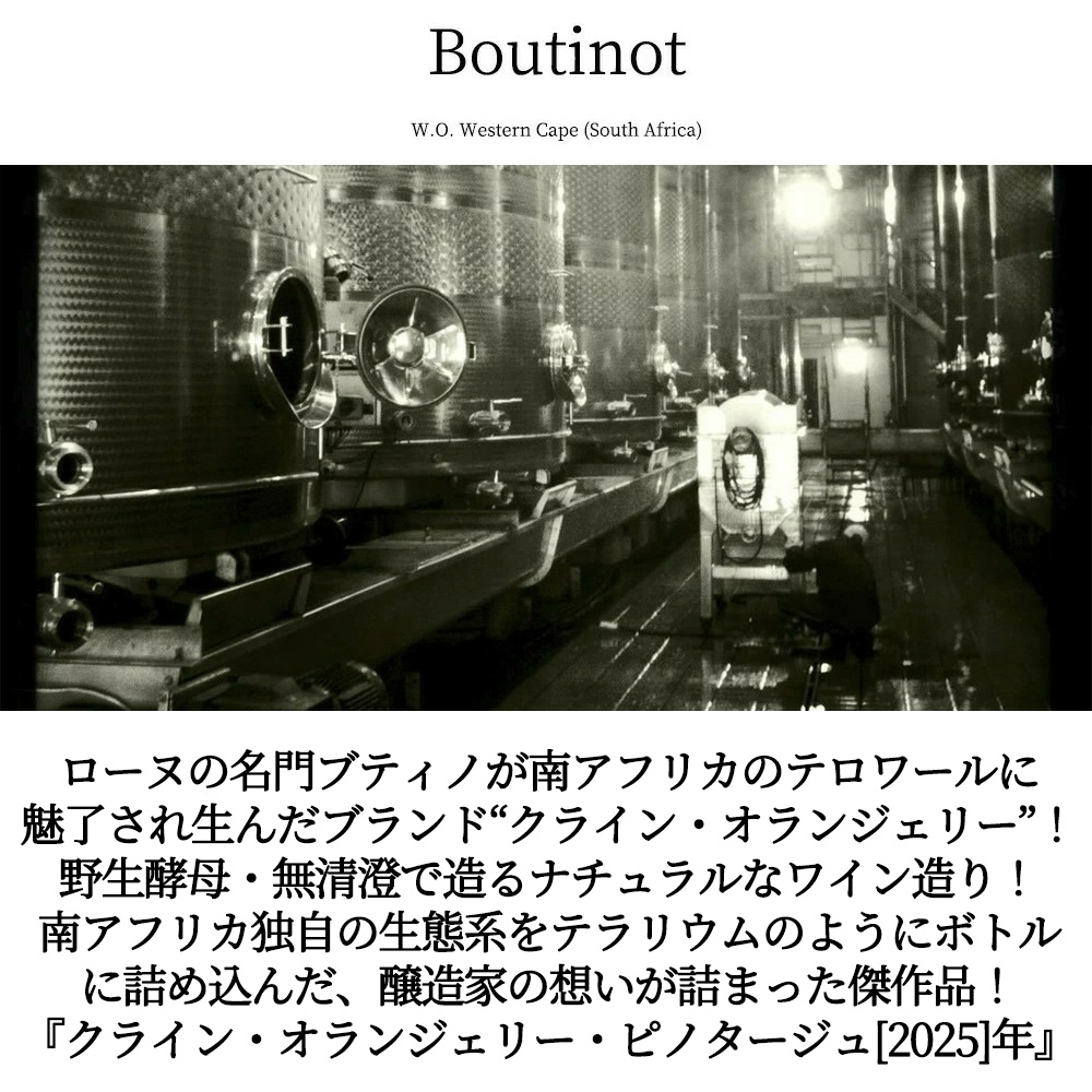 クライン オランジェリー ピノタージュ 2025 SAブティノ社 南アフリカ W.O.ウエスタン ケープ サステナブル農法 Kleine Oranjerie Fauna&Flora Pinotage 2025 Boutinot