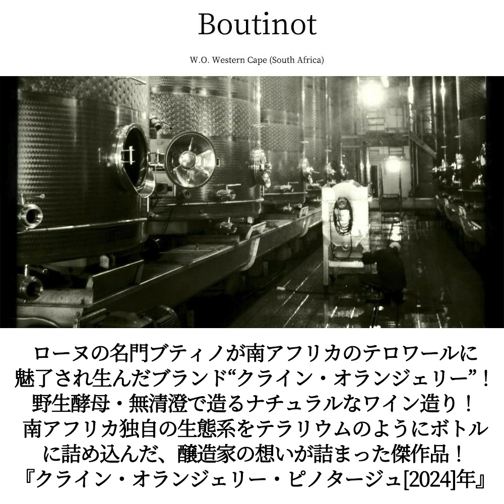 【商品説明】南アフリカワイン愛好家大注目!ピノ・タージュ愛好家大注目!ローヌの名門ブティノが南アフリカのテロワールに魅了され生んだブランド!“クライン・オランジェリー”!南アフリカ独自の生態系をテラリウムのようにボトルに詰め込んだ、醸造家の想いが詰まったブランド!カジュアルでありながらも、野生酵母・無清澄で造るナチュラルなワイン造りで好評!造り手は、世界の美食が集まる街、ロンドンの高級地区で、レストラン経営で成功を収めた資産家のもとに生まれた創業者のポール・ブティノ氏!自身がワイン愛好家だったポール氏は、やがて父親の仕事を手伝うようになると、当時(1970年代)のロンドンで流通していたワインの品質に疑問を抱くようになりました!そして自らフランスへ出向いて、レストランで喜ばれるワインの仕入れを始めます!その噂は徐々に広がり、他のレストランからもワインの仕入れを頼まれるようになると、その思いは「レストランで喜ばれるワイン造り!」へと発展します!飲み頃でストーリーがあり、リーズナブルな価格のワイン!その思いは今も変わらず、ブティノ社のワイン造りに反映されています!今日ブティノ社のワインは多くの支持を集め、彼らのワイン造りは国境を超え、世界各国の有名ワイン産地にまで広がりました!中でも注目したい産地の一つがこの南アフリカ!このクライン・オランジェリーはブティノ社が手掛ける南アフリカ産のブランド!銘醸地パールやエルギンのブドウをふんだんに使用した大人気シリーズ!この「クライン・オランジェリー・ピノタージュ」は、サステナブル農法!花崗岩の畑からの平均樹齢21年のピノ・タージュ100%(南アフリカの独自性を主張する希少品種!1924年にステレンボッシュ大学のアブラハム・イサク・ペロルド教授によりサンソーの雌花にピノ・ノワールを交配させて誕生した大人気品種ピノタージュ!)をステンレスタンク(全房醗酵40%)!ステンレスタンクとフレンチオークでそれぞれ9ヶ月(新樽30%)熟成で造られるミディアムボディ辛口赤ワイン!エチケットの動物は「ホシヤブガメ」!鮮やかなルビー色から、熟したプラムとチェリーのアロマ!口に含むと、深みのある黒果実が広がり、余韻にはスモーキーなオークのニュアンスが心地良く続きます!アルコール度数14%、コスパ抜群の南アフリカ産ピノ・タージュが限定で少量入荷!