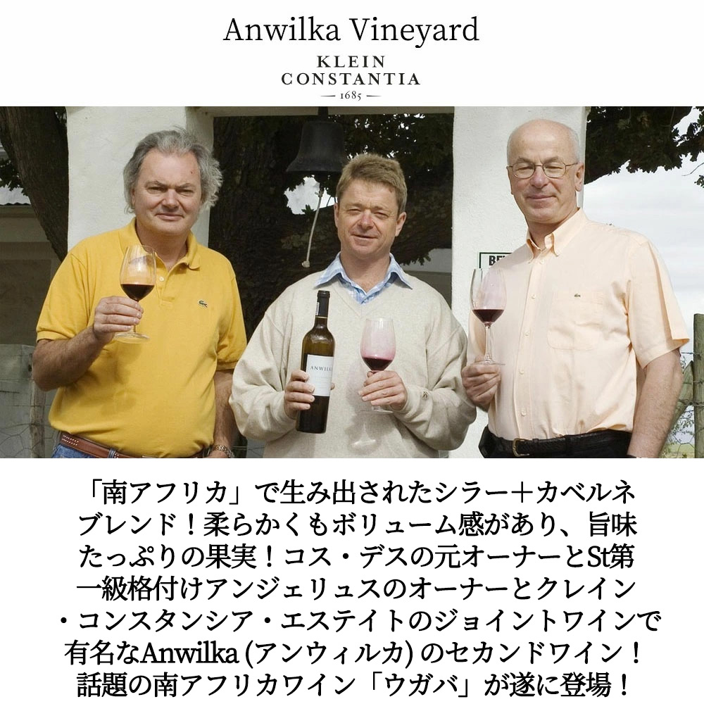 【商品説明】南アフリカ フルボディ辛口赤ワインファン大注目!ボルドーの名門をも魅了する地「南アフリカ」で生み出されたシラー+カベルネブレンド! 柔らかくもボリューム感があり旨味たっぷりの果実!ボルドーの銘醸、シャトー・コス・デストゥルネルの元オーナーと、サンテミリオン第一級格付けシャトー・アンジェリュスのオーナーとクレイン・コンスタンシア・エステイトのジョイントワインで有名な“Anwilka(アンウィルカ)”のセカンドワイン! アンウィルカ・ヴィンヤードについてインポーターさんは「2005年にブルーノ・プラッツ氏、ユベール・ド・ブアール氏が南アフリカの銘醸クレイン・コンスタンシアとが協力して設立したワイナリー。2009年にはワイナリーを改築し、様々なサイズのタンクを完備。これにより、大きさの異なる畑の区画毎の醸造と管理が可能になりました。南アフリカ最古の歴史を誇る名門ワイナリーの共同所有者ロウウェル・ユースト氏は南アフリカで最も歴史ある名門ワイナリー、クレイン・コンスタンシアの共同所有者。アンウィルカのワインはこの南アフリカ最高の名門ワイナリーで保管されます。南アフリカのテロワールが生み出す果実のリッチさ、しなやかさとボルドーのワイン醸造哲学が生み出す繊細さとバランスの良さを持つワインがコンセプトです。南アフリカの自然環境を大切にするため、栽培ではサステーナブル農法を実施しています。ボルドーのワイン醸造哲学が生み出す繊細さとバランスの良さを南アフリカのテロワールが生み出す果実のリッチさとしなやかさに活かす事を目指しています。コス・デストゥルネルをメドックのスーパー・セカンドと呼ばれるまでに育て上げたブルーノ・プラッツ氏。サン・テミリオンでアンジェリュスの第一特別級昇格を果たしたユベール・ド・ブアール氏。南アフリカ最高の名声と歴史を誇るクレイン・コンスタンシアのロウウェル・ユースト氏。三氏のコラボレーションで誕生したワイナリーがアンウィルカ・ヴィンヤードです。」! 水はけのよい古く風化した酸化鉄を含む岩の多い土壌からのサステナブル農法のシラー60%、カベルネ・ソーヴィニヨン22%、プティ・ヴェルド15%、マルベック3%を、収量25hl/ha、フレンチオーク樽200L、400Lで12ヶ月熟成で造られる、究極フルボディ辛口赤ワイン! 2023年について「生育状況は良好で、ブドウは安定して均一に熟すことができました。」と大注目ヴィンテージ! 輝きのある深いルビー色!開放的で魅力的な香りが何層にも折り重なり、マルベリーやプラムといった熟した赤果実の活き活きとしたアロマに、炒ったスパイス、ダークチョコレート、コーヒー豆のアクセントが加わる!心地よい飲み口でフルボディ!明るい酸と優しくトーストされた樽のスパイシーさ、滑らかで充実した味わいが、余韻まで長く続く究極フルボディ赤ワインが、最新ヴィンテージで素晴らしい出来となった[2023]年で少量入荷! 赤身肉料理やローストラム、ローストポークとの相性抜群!今すぐ楽しめますが、5年以上の熟成でさらなる深みを増します!