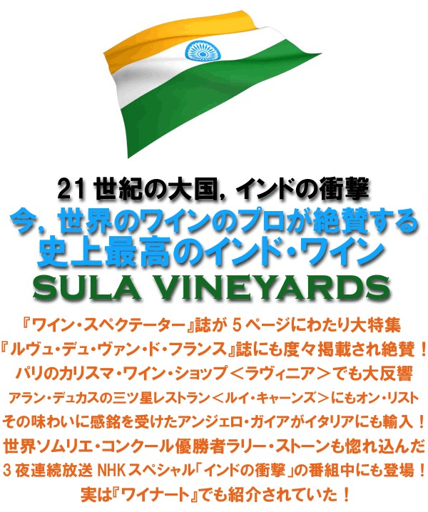 21世紀の大国、インドの衝撃!!今、世界のワインのプロを虜にする史上最高のインドワイン!インド最高峰のワイナリーが世界のワイン・マニアに真価を問う衝撃のワインがついに日本上陸!!なかでもソーヴィニヨンブランと並び、スラ・ヴィンヤーズ独自のスタイルを最も良く表現したキュヴェ!2013年世界最優秀ソムリエコンクール公開決勝ブラインド試飲ワイン!18年ぶりに東京で開催された世界大会のファイナルにこのシュナン・ブランの2011年ものが採用され話題に!スラのシュナン・ブランはブラインドテイスティング4種の1つで、唯一の白ワインとして抜擢!世界一のソムリエ“パオロ・バッソ”が、日本の“甲州”とコメントしたほどのきれいな風味のある白ワイン!セミ・ドライですっきりとしたパイナップルなどの果実味に溢れたワイン!甘みとスパイスが効いた東南アジア料理やジャラート料理との相性が抜群!食前酒にも最適!最先端インド・ワインの現状を知る上で,絶対に味わっておきたい極めつきの白ワイン!が限定少量入荷!