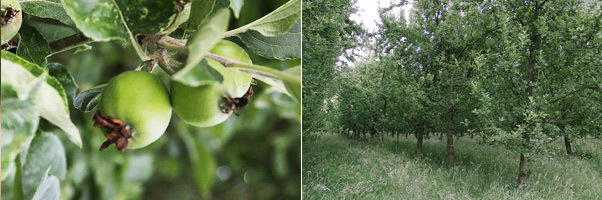 ンゴの収穫時期は、10~11月。収穫の合図は、リンゴが知らせてくれます。樹でじっくりと成熟したリンゴの実が、自然に落下するのです。それが果実からの収穫のサインです。ビオロジックの畑は、ふさふさした草に覆われているため、下草がいわばリンゴのクッションです。シードル用のリンゴは、日本の食用よりも一回り小さなリンゴです。落ちた完熟リンゴは、ひとつ一つ手で拾い選果しながら収穫します。リンゴ園も今では、50ha程度まで広がり、樹齢4~23年の樹を約25,000本育てています。果樹園には、シードル醸造向けの品種ドゥース、アメール、ドゥース・アメール、アシデュレはもちろん、全15品種のリンゴの樹が植わっています。リンゴ園は、鳥や虫のさえずりが響きわたり、まるで小さな森のようです。