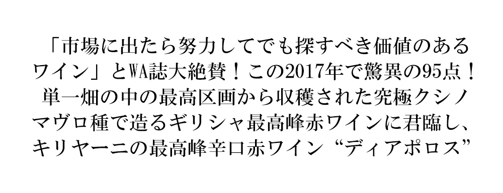 ディアポロス 2017 キリ ヤーニ 固有品種 クシノマヴロ種使用 P.G.I.イマティア ワインアドヴォケイト95点 赤ワイン ギリシャワイン