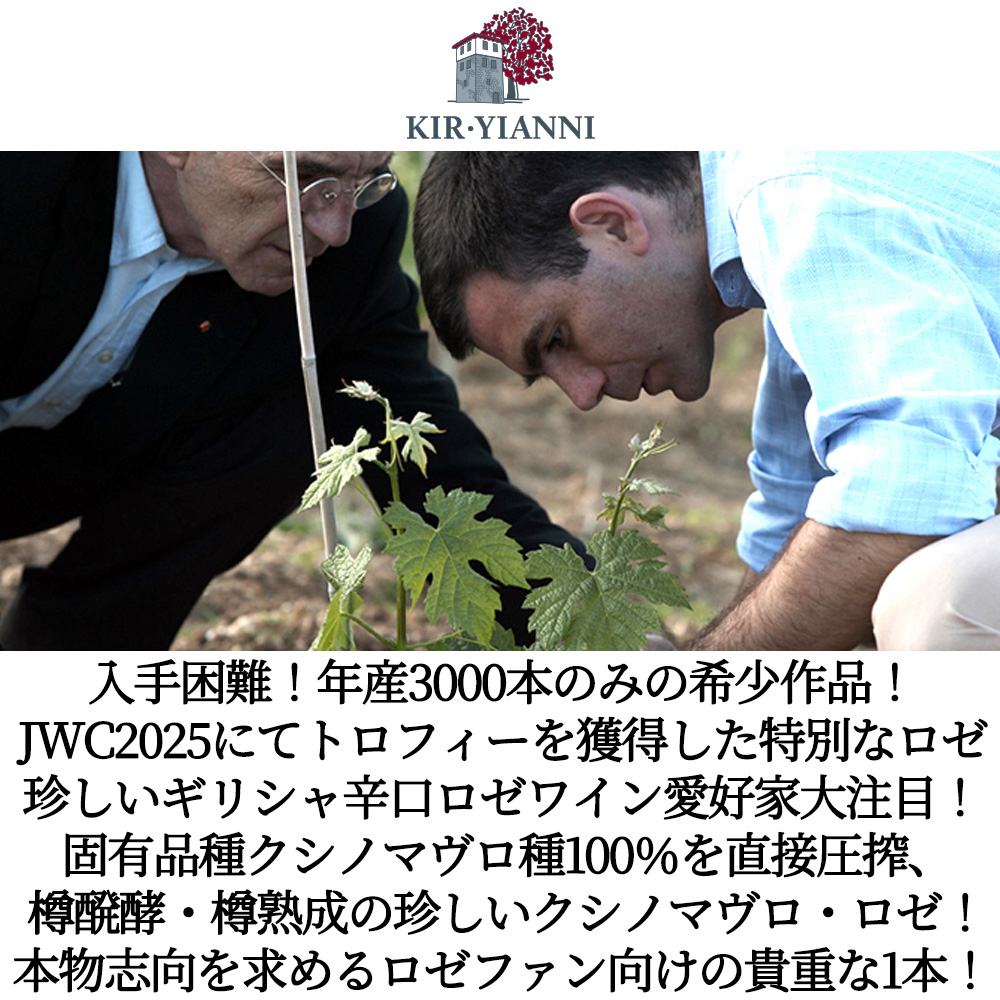 【商品説明】珍しいギリシャワイン愛好家大注目!辛口ロゼワイン愛好家大注目!年産3000本のみの希少作品!直接圧搾、樽醗酵・樽熟成の珍しいクシノマヴロ・ロゼ!ジャパン・ワイン・チャレンジ2025にてトロフィ・ベスト・オールド・ワールド・ロゼの快挙!ワインアドヴォケイト誌で「市場に出たら努力してでも探すべき価値のあるワイン」と大絶賛!ワインアドヴォケイト誌が“ギリシャ最高峰のワイン”に選んだ固有品種クシノマヴロ!世界のワイン評論家、マスター・オブ・ワインをも感動させる伝統とモダンが見事に融合した、鮮烈にして忘れられない味わい! 北ギリシャ、西マケドニア地方で生まれる高貴なブドウ「クシノマヴロ」100%の超希少ロゼ!ジャンシス・ロビンソンM.Wや、ギリシャ人M.WのKonstantinos Lazarakis氏等多くのマスター・オブ・ワインがその品質を高く認めて推薦する、ギリシャ最高峰ワイナリーのひとつ“キリ・ヤーニ”は、名門ブタリス家4代目当主ヤーニス・ブタリス氏によって1997年に設立!クシノマヴロの銘醸地として名高い北ギリシャ・ヴェルミオン山の山腹の両斜面に位置する、ナウサとアミンデオンの地で地方の固有品種と伝統を大切に守り、更に革新的なワイン造りで、今日キリ・ヤーニのクシノマヴロはギリシャを代表するアイコンワインに!徹底的にその生態について研究し、クローン選択から栽培地、栽培方法、そして醸造方法にいたるまで全ての過程で繰り返し実験を行い、今日世界が感動するワインを誕生させた最高峰ギリシャワイン選出の、今、世界が大注目する「キリヤーニ」が造る年産3000本の超限定生産ロゼ!ギリシャ語で「酸と黒」の意味を持つ、ギリシャ固有の品種「クシノマヴロ」!北ギリシャ原産で世界で最も珍しい“高貴な黒ブドウ品種”の一つとして知られています!北ギリシャは地中海性気候から大陸性気候まで多様な気候帯を持ち、土壌や標高、地形も異なることからミクロクリマが存在! 「キリ・ヤーニ」では多彩なテロワールの中でも特に標高の高い地区を中心に、長年の研究により選び抜かれたクローンやフィロキセラ前の古木を栽培!これらの貴重なブドウ樹は、区画毎に栽培管理がなされ、全て手作業で収穫!更には区画毎に醸造を行います! このアガソト・ロゼ[2024]年は、ギリシャを代表する高貴な地ブドウ「クシノマヴロ」から生まれる唯一無二な味わい!ナウサ地区の14のサブリージョンの一つ標高220メートルの南向きの斜面に広がるシングル・ブロックの「ガストラ」産のクシノマヴロ種100%を使用した特別なロゼ!粒と房に分けて直接圧搾!フレンチオーク樽(228L)とトノー(1hl)にて醗酵!トノー樽にて8ヶ月熟成で造られる辛口ロゼワイン! 淡いサーモンピンクの外観!香りはイチゴやラズベリーなどの赤系果実に、トマトやドライハーブ、ほのかなラベンダー、心地よいバリックのニュアンスを持ちます!口当たりはフレッシュで、クシノマヴロ由来の伸びやかな酸が全体を引き締め、軽やかながらも芯のある構造を形成!ほのかなタンニンが味わいに奥行きを与え、甘さは控えめの辛口!爽やかさと旨みが調和し、余韻にはハーブと赤果実の風味が心地よく続く唯一無二の辛口ロゼワイン!本物志向を求めるロゼワインファン向けの貴重な1本! 魚介料理(特にトマトやハーブを使う料理)、ハーブチキンのグリル、ポークのトマト煮込み等の鶏肉・軽めの肉料理との相性も抜群!