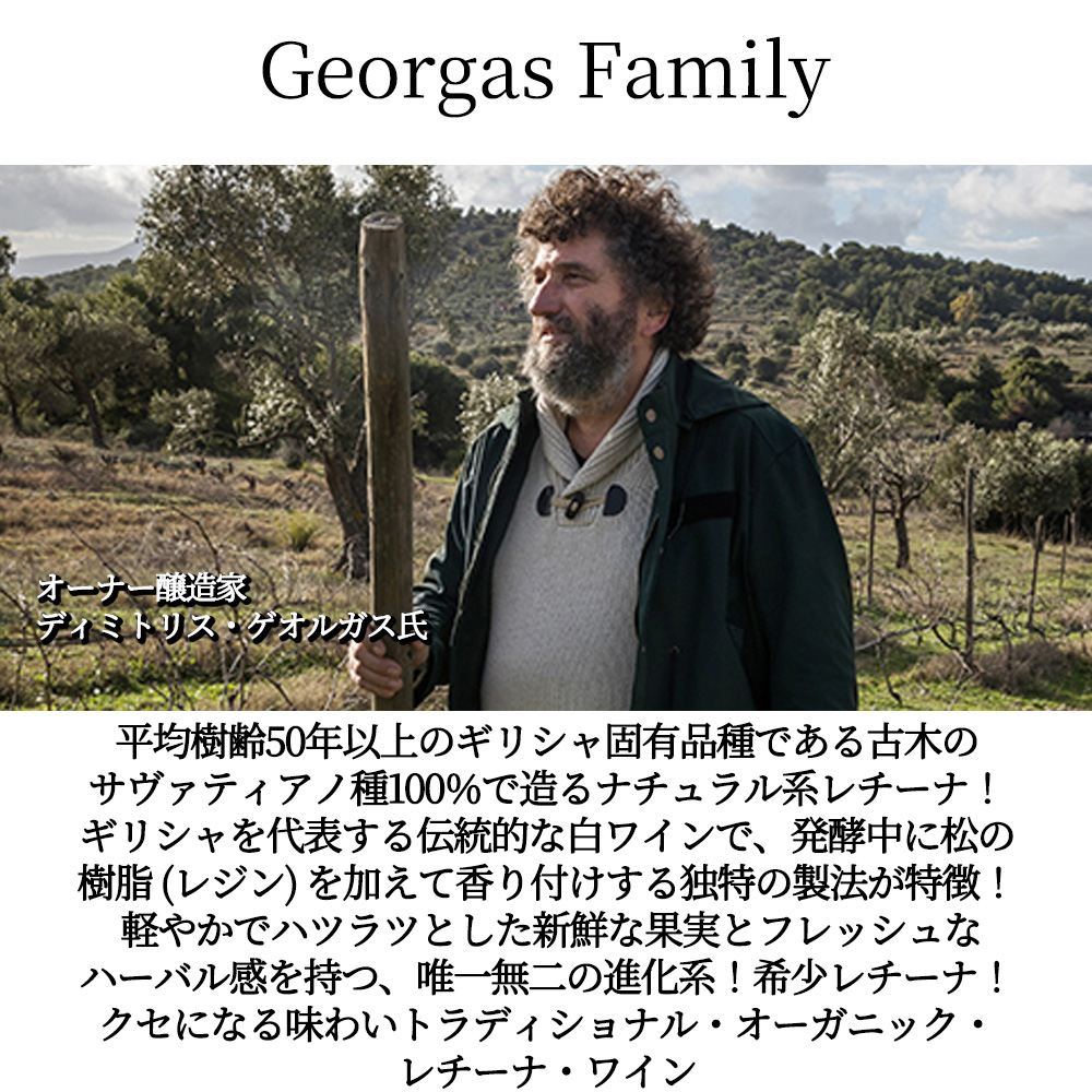 【商品説明】ギリシャワイン愛好家大注目!レチーナファン大注目!樹齢50年以上のギリシャ固有品種である古木のサヴァティアノ種100%で造るナチュラル系レチーナ!軽やかでハツラツとした新鮮な果実とフレッシュなハーバル感を持つ、唯一無二の進化系! レチーナは、ギリシャを代表する伝統的な白ワインで、発酵中に松の樹脂(レジン)を加えて香り付けする独特の製法が特徴!その起源は古代ギリシャ時代にさかのぼり、ワインを保存する際にアンフォラ(壺)の密閉に松脂が使われ、その香りがワインに移ったことから始まりました!現在ではその風味自体が魅力として受け継がれています!主にサヴァティアノという土着品種が使用され、味わいは柑橘の爽やかさに加え、松やハーブ、樹脂のような個性的な香りとほのかな苦味が感じられます! 一般的な白ワインとは大きく異なり好みが分かれますが、オリーブやフェタチーズ、魚のグリルなど地中海料理と合わせることでその魅力が引き立ちます!近年はナチュラルワインとしての評価も高まり、伝統と現代的な造りが融合したスタイルとして注目されています! 造り手のゲオルガス・ファミリーについてインポーターさんは「アテネから東に20キロ、アッティカ地区スパタの町で380年以上の伝統を持つ家族経営のワイナリーです。この地はレチーナの中心地として知られ、古木のサヴァティアノが多くみられる地区でもあります。彼らの家族が住む通りは、家族の古いワイナリーがあった場所であり、その通り名は「G.ゲオルガス通」と名がついています。現在のワイナリーは、スパタの町にある歴史的なワイナリー“カンバス”の建物を修復して使用しています。現在自社畑のサイズは4.5haあり、有機栽培(DIO認定)及びビオディナ農法を用いてブドウを栽培しています。気候は大変乾燥していることから収量は非常に低く、21hl/ha程しか取れませんが、量より質にこだわり高い品質のブドウを栽培しています。また、ワイン醸造では可能な限り人的介入を減らし、自然なプロセスで行われます。醗酵には酵母添加を行わずブドウを自然醗酵させ、亜硫酸も必要最低限に抑え、白ブドウは最大1週間のスキンコンタクトを施し醸造を行います。 蔵では伝統的なレチーナワインワインから、自然醗酵させたサヴァティアノ(亜硫酸無添加)、更には興味深い地ブドウを使用したペット・ナット等自然派ワインファンを魅了する魅惑的で高い品質のワインを生み出しています。」! この「トラディショナル・オーガニック・レチーナ・ワイン・NV」は、石灰岩を母岩に持ち、炭酸カルシウム豊富な白い粘土質、マール土壌からの平均樹齢50年以上の古木のサヴァティアノ種100%を破砕、プレス後スキンコンタクト3日、ステンレスタンクにてジュースと松脂を入れ自然醗酵、軽い濾過を行う!ステンレスタンク2ヵ月(松脂と共に)、松脂を取り除いて濾過してリリースされる辛口白ワイン!しかも松脂は高級産地アッティカ産アレッポ松脂のみを使用(1本の木から約1kgの樹脂と収量が少ない高級樹脂)!非常に個性的で印象に残る味わいが特徴の辛口白ワイン! 口に含むとまず、グレープフルーツやレモンのような柑橘系の爽やかな酸味が広がり、続いて松の樹脂由来のハーバルで清涼感のある香りが立ち上がります!ローズマリーやオレガノを思わせる風味に加え、ほのかに薬草のようなニュアンスも感じられます!甘さはほとんどなくドライで、後味には軽い苦味とともにすっきりとしたキレが残ります! 一般的な白ワインよりもフルーティーさは控えめで、むしろハーブや樹脂の風味が主役となるため、独特ながらもクセになる味わいです!ペアリングには、ハーブやニンニク、ショウガ、スパイス、味噌、酒粕等を使った料理!魚介類(魚の塩漬け、磯風味が強い貝類、魚のフリッター、イカのアーリオオーリオなど)、肉料理(炭火焼の牛肉、ラム肉、鶏肉、焼き肉など)