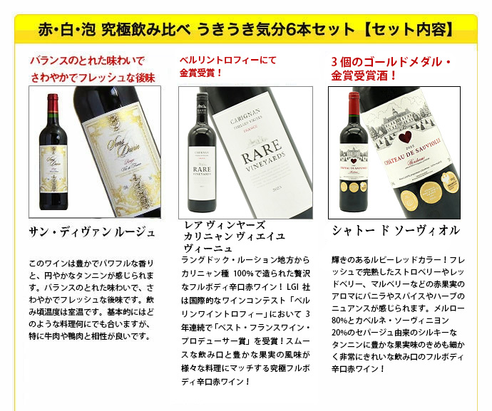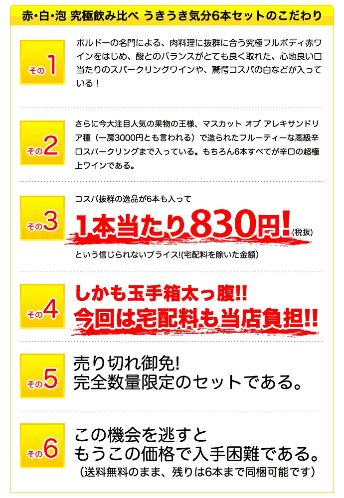 【商品名】【送料無料】スタッフ超厳選!コスパ抜群!赤・白・泡・究極飲み比べうきうき気分6本セット【商品説明】うきうきワインの玉手箱厳選!「毎日の食卓に」をコンセプトにコスパ抜群の赤・白・発泡を100種類の中からセレクト!など、赤3本、白2本、泡1本の計6本が入って4980円(税抜)!宅配料を除くと、1本あたり830円(税抜)!まさに完全赤字覚悟の究極飲み比べセット!さらに今回送料当店 負担!売り切れ御免!完全数量限定で販売決定!