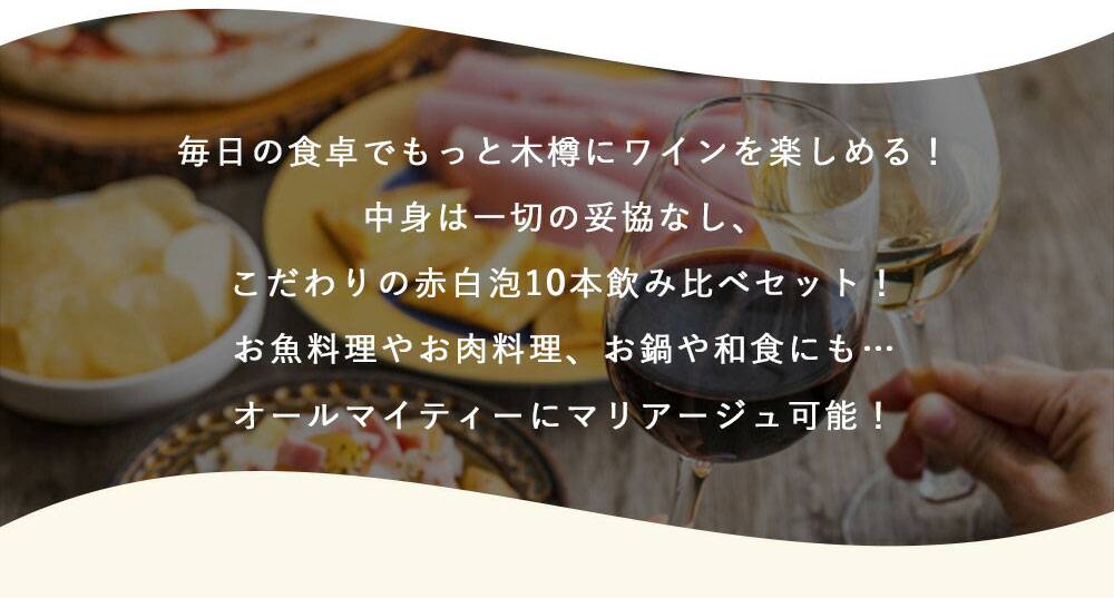 【商品名】【送料無料】ワインセット 高品質保証!ランク上の赤ワイン 白ワイン スパークリングワイン 家飲みワイン10本セット 家飲み【商品説明】うきうきワインの玉手箱厳選!「ご自宅で本格派ワインを気軽にお楽しみいただきたい」!毎日の食卓でもっと気軽にワインを飲んで頂きたいという思いを込めて誕生したワインセット!家飲みワインセットに上級版(ランク上の高品質)が新登場!中身は一切の妥協なし!こだわりの10本(赤5本・白3本・泡2本)をスタッフ一同でセレクト!このワインセットで赤・白・泡の飲み比べができる!さらにお魚料理やお肉料理、お鍋料理等オールマイティーにマリアージュ可能!家飲み応援セットと致しまして特別価格でご案内!しかも送料無料でお届け!