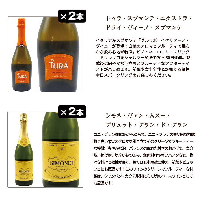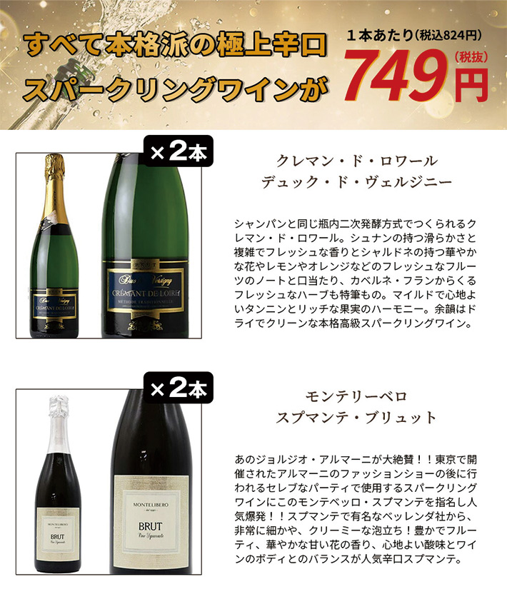 【商品説明】超限定販売!家飲み応援プライスで頑張ります!うきうき厳選の高級辛口スパークリング12本セット!玉手箱のスパークリングセットは中身で勝負!絶対に妥協はしません!東京で開催された高級ブランドのファッションショーの後に行われるセレブなパーティで使用するスパークリングワインに指名された人気辛口スプマンテをはじめ、シャンパーニュと同じ瓶内二次発酵方式の本格辛口高級規格D.Oカバ・ブリュット!さらにはデザイン、味わいともに高評価の辛口スパークリングワインなど、計6本の究極辛口スパークリングが入った究極スパークリング12本セット(6種類×各2本)が1本あたり驚異の749円(税抜)で味わえる!しかも送料当店負担でお届けいたします。BBQやパーティーに!毎日の食卓に!高級辛口スパークリングワインで乾杯!家飲み応援スペシャル・プライスでご販売!完全赤字価格でご案内!