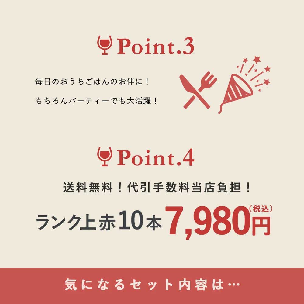 【商品説明】ワインのプロが超厳選!辛口赤ワイン愛好家に朗報!「ワインは難しい」「何を選んでよいか分からない」という方にも超お薦め! 「ご自宅で本格派赤ワインを気軽にお楽しみいただきたい」! 「毎日の食卓でもっと気軽にワインを飲んで頂きたい」! 「もちろん飲食店様のグラス用、ボトル用にもお使いいただきたい」! という思いを込めて、玉手箱スタッフが厳選!ランク上の赤ワインが大集結!しかも世界著名5か国のワイン入り!しかも品種も多種多様! 女性醸造家が石灰岩質、砂質、砂利質と異なる土壌に恵まれた肥沃なテロワールに惚れ込んで造られた葡萄を使用、まったり濃厚、甘美でチョコレートの様な風味のラトック・リザーブが1本! さらにローヌ地方を代表する銘醸生産者であり、世界のトップクラスのワイン生産者として知られるM.シャプティ社の最高コスパ南仏赤ワイン! 高級グラン・レゼルバ規格の高級スパニッシュや樽熟成100%のチリ・ピノ、高級カリフォルニア・カベルネまで入ったランク上の赤ワインが大集結! この内容で1本あたり驚異の798円(税込)で味わえる!びっくり価格7,980円(税込)!しかも送料無料でお届け! 超こだわり極旨赤ワイン飲み比べ最高コスパ10本ワインセットでワインライフをお楽しみください!