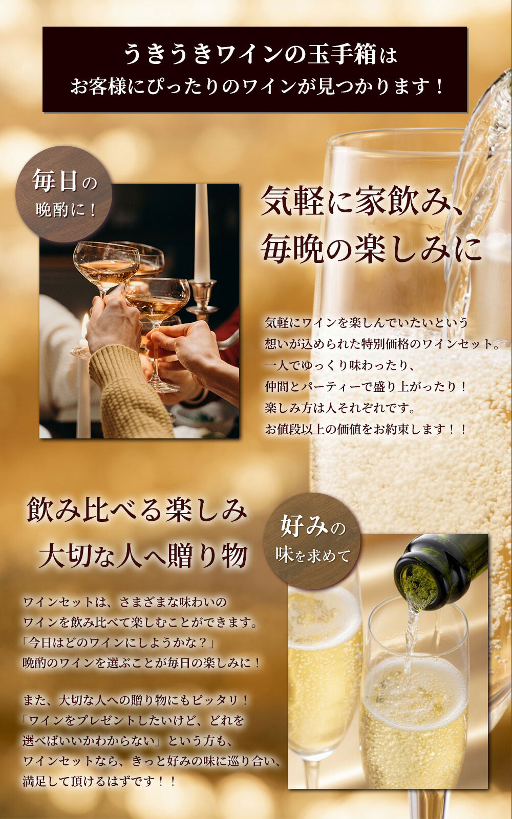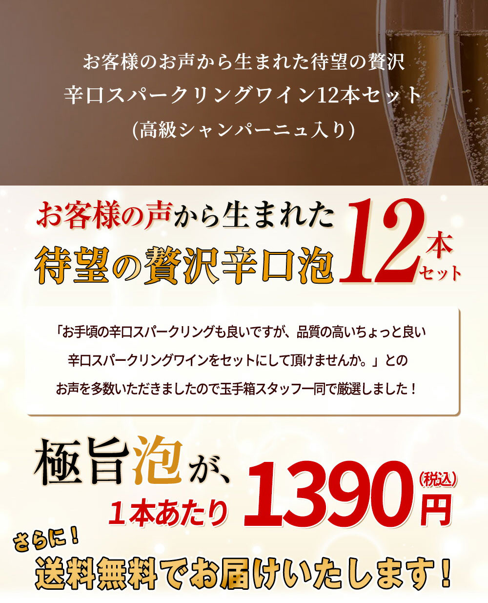 【商品名】【送料無料】お客様のお声から生まれた待望の贅沢辛口スパークリングワイン12本セット (高級シャンパーニュ入り) ワインセット【商品説明】高級辛口スパークリング愛好家大注目!お客様のお声から生まれた待望の贅沢辛口スパークリングワイン12本セット!しかも高級シャンパーニュ2本入り!「お手頃の辛口スパークリングも良いですが、品質の高いちょっと良い辛口スパークリングワインをセットにして頂けませんか。」とのお声を多数いただきましたので玉手箱スタッフ一同で厳選しました!このスペシャル豪華泡12本セットで泡三昧してください!中身は高級シャンパーニュに、シャンパーニュ製法の高級クレマン、これまたシャンパーニュ製法の高級カヴァ、残りも各国が誇るスパークリングワインが入って計12本! 1本あたり1,390円(税込)でこの内容は間違いなくお買い得です!高級シャンパーニュに、高級クレマンに、高級カヴァが入ってまさに限界価格のスペシャルプライス!普段飲みに!パーティーで!大活躍間違いなしの贅沢辛口スパークリングワイン12本セット!このセットで泡三昧してください!しかも送料無料でお届けいたします!