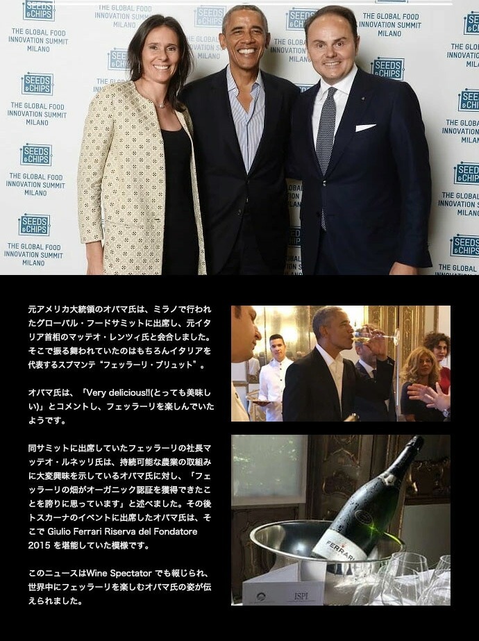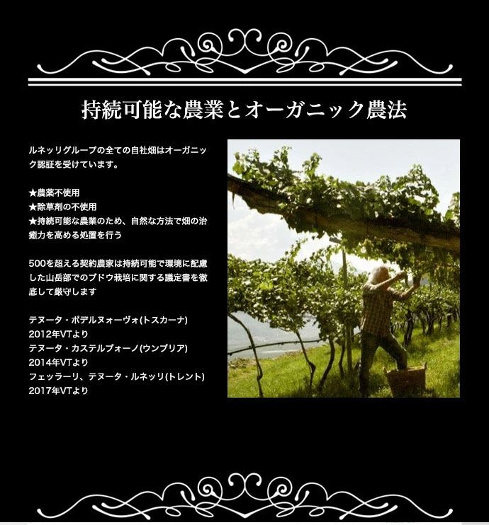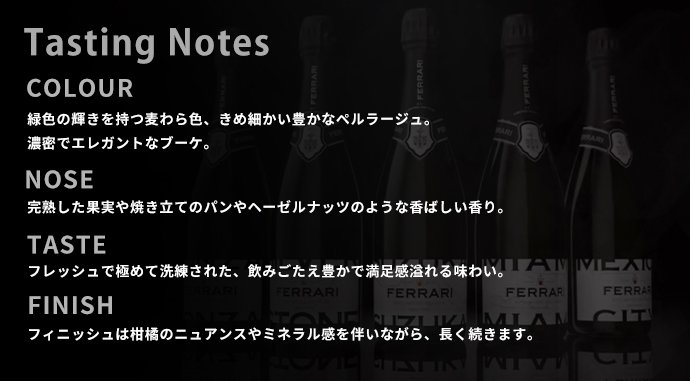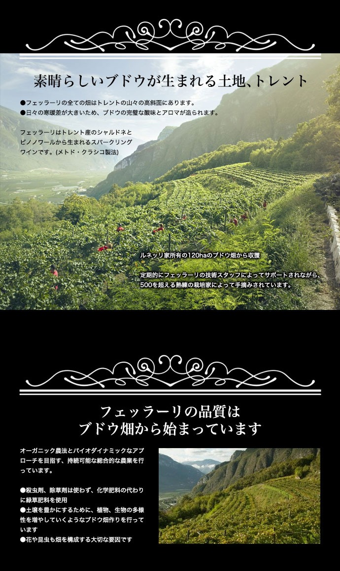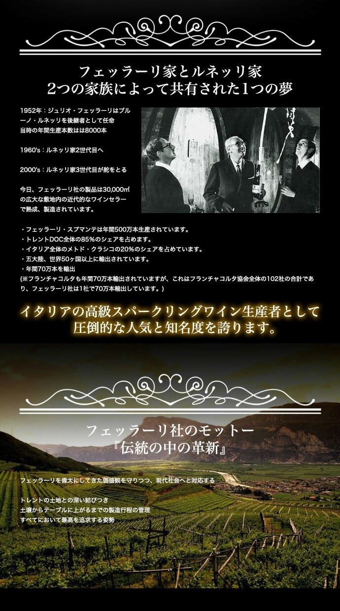 ![]() フェッラーリスプマンテは、発売以来国境を越えて世界の五つの大陸に輸出されています。スプマンテ事業の参入がもっとも難しいとされるフランスでも愛飲されているきわめて稀なスプマンテ。パリの有名なナイトスポットである“リド”で、シャンパンリストの中にただひとつ載っているスプマンテとしても有名です。 またフェッラーリは、イタリアの大統領官邸をはじめ、国外のイタリア大使館の公式晩餐会の食卓でも必ずサーヴされるスプマンテとしても有名です。レーガンからゴルバチョフ、ブッシュ、エリザベス女王、ムバラク、ミッテラン、クリントン、そしてジェノバサミットでの小泉首相まで、世界のリーダーたちがこのフェッラーリで乾杯をしてきました。 ![]() フェッラーリ社は、ジュリオ・フェッラーリが1902年にイタリアのトレンティーノで「メトッド・クラシコ(クラシカル・メソッド=シャンパーニュと同じ瓶内二次発酵による製法)」によるスプマンテを造りはじめた時に起源を発します。 ジュリオ・フェッラーリは「メトッド・クラシコ」で造るイタリアのスプマンテのパイオニアのひとりというだけでなく、フランスから持ち込んだシャルドネを用いて初めてスプマンテを造った生産者でした。ドイツのガイゼンハイム、フランスでも醸造を学んだ後シャンパーニュの生産者のもとで研修をしたフェッラーリは、醸造機器もすべてシャンパーニュから学び、かの地と同じ品種、同じ製法でスプマンテを造りはじめました。 ![]() その後ジュリオ・フェッラーリが設立したワイナリーは、1952年に現在のオーナーであるルネッリ・ファミリーに引き継がれました。当主のブルーノ・ルネッリの3人の息子たちフランコ、ジーノ、マウロは、スプマンテ造りを自らの天命と信じたジュリオ・フェッラーリの製品造りの信条を充分に理解し、維持、発展させていくことになります。トレンティーノの優れたぶどう畑からとれる高品質なぶどうと、古い製法のルールに厳格なほどに忠実なこと。それがジュリオ・フェッラーリの信条でした。ルネッリ・ファミリーが製品づくりのうえでもっとも大切にしていること、それは彼らが造りだす製品が常に最高の品質を誇ること、そして トレントの土地への忠実な信頼。 その価値観に従って造りだされる「フェッラーリスプマンテ」は、今ではイタリアを代表する伝説的な製品となっています。 |