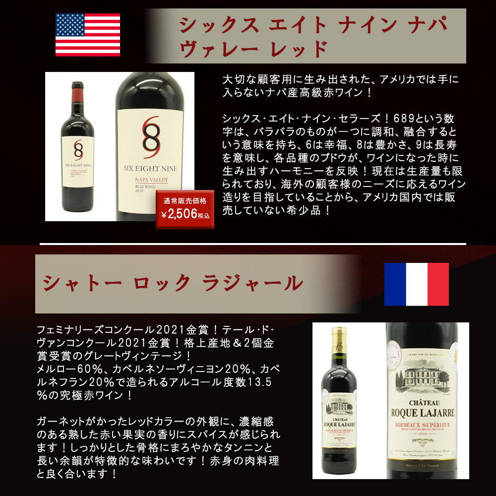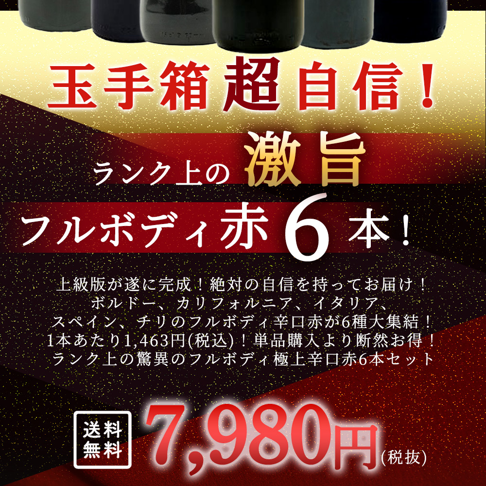 【商品名】【送料無料】ワイン ワインセット 超厳選!ランク上の驚異のフルボディ極上赤ワイン6本セット【ワインセット】【ワイン ギフト】【wine】【赤ワイン】【商品説明】玉手箱厳選!当店No.1人気を誇るワインセット!極上フルボディ赤ワイン6本セットにランク上の上級版が遂に完成!当店大人気の高級ナパ産シックス・エイト・ナインをはじめ、高級ボルドーの金賞受賞の究極フルボディ赤ワイン、チリ最高峰ヴィーニャ・エラスリス上級品マックス・カベルネ、スペインNo.1人気と言っても過言ではないクネ・クリアンサなどのの豪華計6本フルボディ飲み比べ赤ワインセット! 1本あたり1,463円(税込)で大人気シックス・エイト・ナインもエラスリス上級品マックス・カベルネも味わえる!単品で購入するより断然お得!カリフォルニア、ボルドー、イタリア、スペイン、チリのフルボディ辛口赤ワインが6種大集結!玉手箱超自信!ランク上の激旨フルボディ赤6本セット、しかも送料無料でお届け!