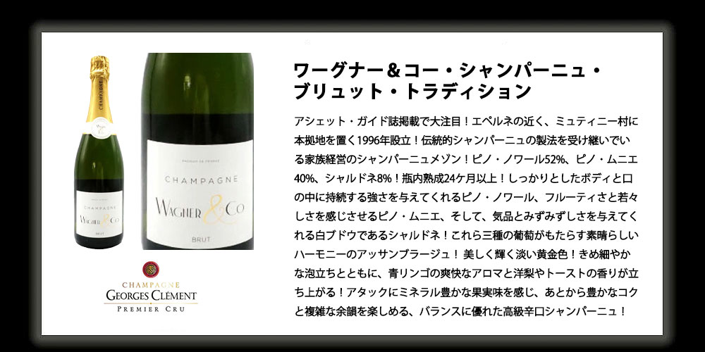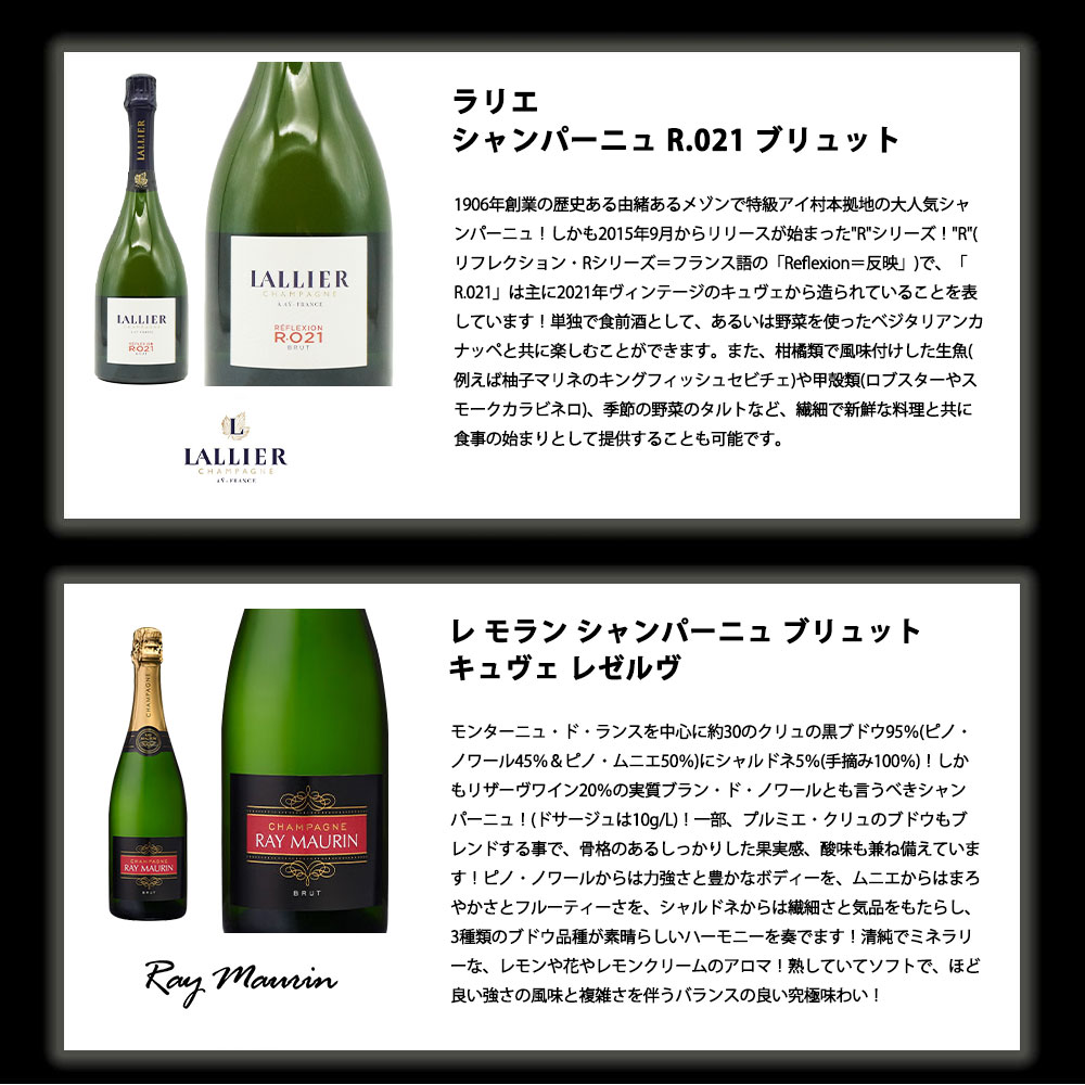 【商品説明】超スペシャル販売!高級有名メゾン・シャンパーニュ飲み比べセット!毎日の食卓を少し贅沢に!記念日の乾杯に!日頃の感謝の気持ちを込めて高級シャンパーニュを赤字覚悟でセレクト!豪華シャンパーニュ飲み比べスペシャル3本セット! 1906年創業の歴史ある由緒あるメゾンで特級アイ村本拠地のラリエ!しかも2015年9月からリリースが始まった“R”シリーズ!まさに毎年の「リフレクション」はセラー・マスターからの贈りもの!ラリエのスタイルの神髄!「リフレクションシリーズ」とは、フランス語の「Reflexion=反映」を意味し、複数のマルチ・ヴィンテージでありながら、中核となるシングルハーベストにフォーカスしたラリエのシグネチャーシャンパーニュ!ラリエのシグネチャースタイルである「ピュア」「フレッシュ」「深み」「凝縮感」という4つの要素をバランスよく表現!ヴィンテージの個性を表現した、美食のためのシャンパーニュ!繊細な果実味とシルキーなテクスチャーに魅了される仕上がりの究極高級シャンパーニュ“ラリエ・シャンパーニュ・R.021・ブリュット”が1本! 1895年モンターニュ・ド・ランスの中心に位置する、シニー・レ・ローズ村(ランスにほど近い)に創業の、100年以上の歴史を誇る名門の家族経営のメゾン!から3種類のブドウ品種が素晴らしいハーモニーを奏でる究極造り手による究極シャンパーニュ!“レ・モラン・シャンパーニュ・ブリュット・キュヴェ・レゼルヴ”が1本! エペルネの近く、ミュティニー村に本拠地を置く1996年設立!伝統的シャンパーニュの製法を受け継いでいる家族経営のシャンパーニュメゾン!ジョルジュ・クレメンの別ブランド!三種のブドウがもたらす素晴らしいハーモニー!“ワーグナー&コー・シャンパーニュ”が1本の、計3本スペシャル・シャンパーニュセット! 驚異のびっくりプライス!1本あたり驚愕の3,659円(税込)!で味わえる!しかも送料無料でお届け!この3本が華やかに彩ってくれること間違いなし! 大判振る舞い究極メゾン・シャンパーニュ飲み比べセット!数量限定でご販売!