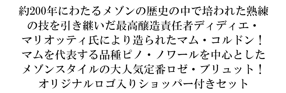 【商品説明】高級シャンパン愛好家大注目!伝統と歴史に育まれたシャンパン“マム(MUMM)”!クラスマンも大注目!世界ランキング第3位!映画「カサブランカ」にも登場!過去、世界最高峰の自動車レース「F1」の公式指定シャンパンにも選ばれた!勝者を祝う場面に欠かせないシャンパーニュを造り出すメゾン・マムから、新しい「グラン・コルドン・ロゼ」がリリース!約200年にわたるメゾンの歴史の中で培われた熟練の技を引き継いだ、最高醸造責任者ディディエ・マリオッティ氏により造られた新しいマム・コルドン!マムを代表する品種ピノ・ノワールを中心としたメゾンスタイルの定番ロゼ・ブリュット!最高醸造責任者ディディエ・マリオッティは、100を超えるクリュ(ブドウ畑)のピノ・ノワール、シャルドネ、ピノ・ムニエから造られた300に及ぶワインより、究極に品質と一貫性を実現!ピノ・ノワール60%、シャルドネ22%、ピノ・ムニエ18%(ピノ・ノワールで力強さとストラクチャーを与え、シャルドネで優雅さとミネラル感、ピノ・ムニエがまろやかさとバランスを表現)!しかもドサージュ僅かの6g/Lで造られた新生マム・グラン・コルドン・ロゼ!優雅に輝くサーモンピンクを主役に、微かに現れる活き活きとしたオレンジ色!フレッシュなイチゴやチェリー、スグリの濃密なフルーツのアロマの奥深くに、ほのかなヴァニラとキャラメルの香り!アタックは活き活きとした、エネルギッシュでドライな口当たり!徐々に微かに夏の果実を感じさせながら、長く余韻の続く、ミネラル感のあるフィニッシュへと導く高級ロゼ・シャンパーニュ!しかも世界的デザイナー、ロス・ラブグローブとのコラボレーションによる斬新なデザイン(「コルドン・ルージュ」で有名なフランス最高勲章レジオン・ドヌールをモチーフに、ブランドを象徴する赤色のリボンをガラスに直接彫り込んだ、立体的かつユニークなデザインを採用)!今回特別にオリジナルロゴ入りショッパー付きのセット!究極マム・グラン・コルドン・ロゼが正規代理店輸入品で待望入荷!