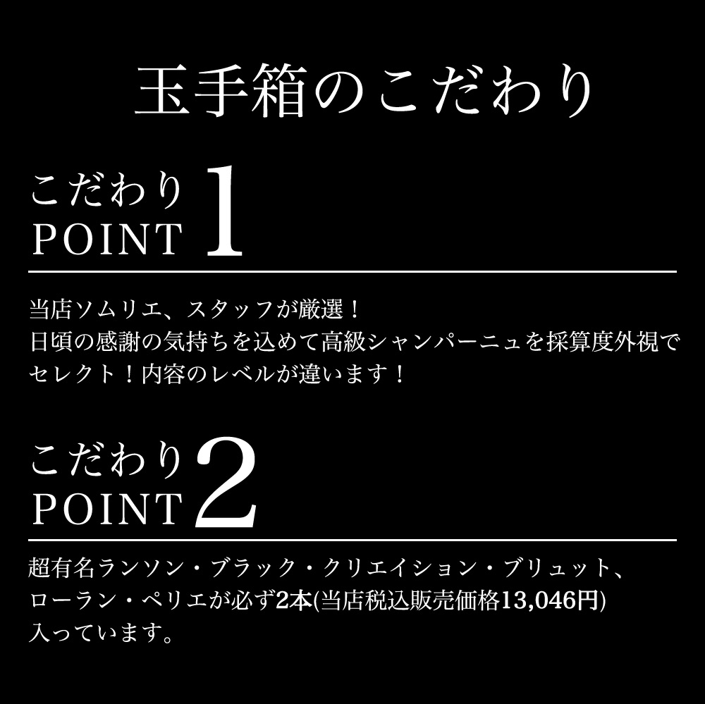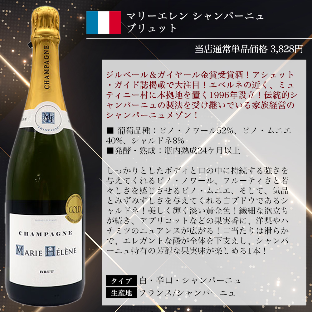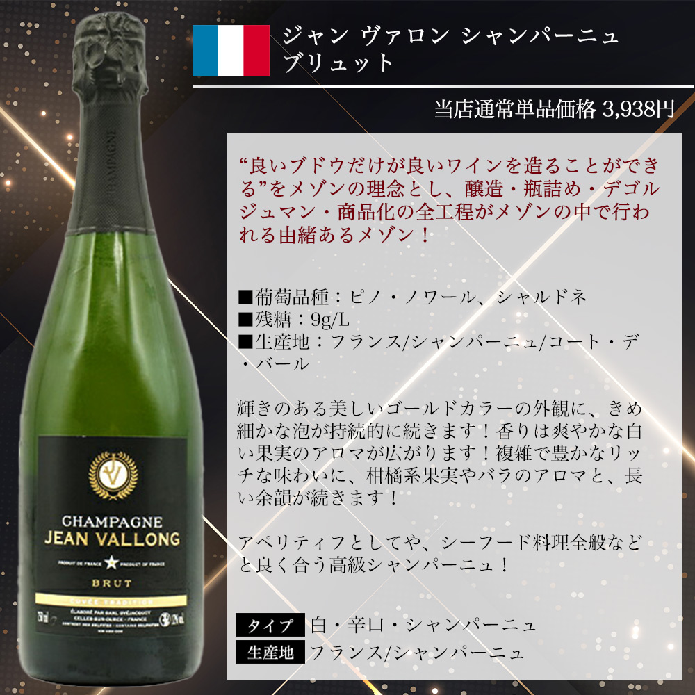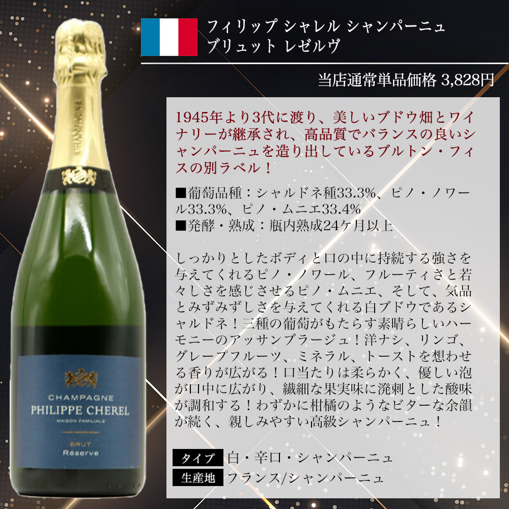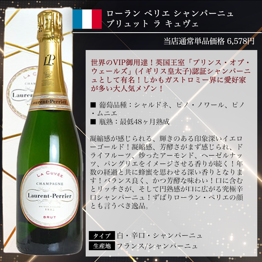 【商品説明】超スペシャル販売!高級シャンパーニュ飲み比べセット!毎日の食卓を少し贅沢に!記念日の乾杯に!日頃の感謝の気持ちを込めて高級シャンパーニュを採算度外視でセレクト!豪華シャンパーニュ飲み比べスペシャル5本セット! 超有名ランソン・ブラック・クリエイション・ブリュット、ローラン・ペリエが必ず2本入って驚愕18,900円(税抜)! 伝統をまとい、ひときわ輝く、誇り高き黒!一世紀以上もの間、英国王室御用達のシャンパーニュとして王室に愛され続け、また、ウィンブルドン・テニストーナメントの公式シャンパーニュとしても長年にわたり選ばれ続けている名門ランソン社の逸品!新しく生まれ変わった大人気ランソン・ブラック・クリエイション・ブリュット!情報の透明性を体現する取り組みの一つとしてこの“クリエイション・シリーズ”として開始!キリッと引き締まった味わいエレガントな辛口!大人気“ブラッククリエイション・ブリュット”が1本! 英国王室をはじめ、世界のVIP御用達!「フレッシュさ」「エレガントさ」「バランスの良さ」がメゾンのスタイル!というローラン・ペリエ社から定番の大人気ブリュット“LP”正規品が1本! 1945年より3代に渡り、美しいブドウ畑とワイナリーが継承され、高品質でバランスの良いシャンパーニュを造り出している家族経営のシャンパーニュ・メゾン!ブルトン・フィスの別ラベル!三種の葡萄がもたらす素晴らしいハーモニーのアッサンブラージュ“フィリップ・シャレル・シャンパーニュ・ブリュット・レゼルヴ”が1本! “良いブドウだけが良いワインを造ることができる”をメゾンの理念とし、醸造・瓶詰め・デゴルジュマン・商品化の全工程がメゾンの中で行われる由緒あるメゾン!輝きのある美しいゴールドカラーの外観に、きめ細かな泡が持続的に続きます!アペリティフとしてや、シーフード料理全般などと良く合う高級シャンパーニュ!ジャン・ヴァロン・シャンパーニュ・ブリュットが1本! アシェット・ガイド誌掲載で大注目!エペルネの近く、ミュティニー村に本拠地を置く1996年設立!伝統的シャンパーニュの製法を受け継いでいる家族経営のシャンパーニュメゾン!「ジョルジュ・クレメン」の別ラベルの高品質シャンパーニュが1本 の、計5本スペシャル・シャンパーニュセット!なんと単品価格の合計22,400円(税抜)+598円(送料)の合計22,998円(税抜)25,297円(税込)がなんと!特別価格の18,900円(税抜)20,790円(税込)!単品で購入するより超お買い得!驚異のびっくりプライス!1本あたり驚愕の3,780円(税抜)!で味わえる!しかも送料無料でお届け!食卓を少し贅沢に!記念日の乾杯に!高級シャンパンが華やかに彩ってくれること間違いなし!大判振る舞い究極メゾン・シャンパーニュ飲み比べ5本セット!数量限定でご販売!