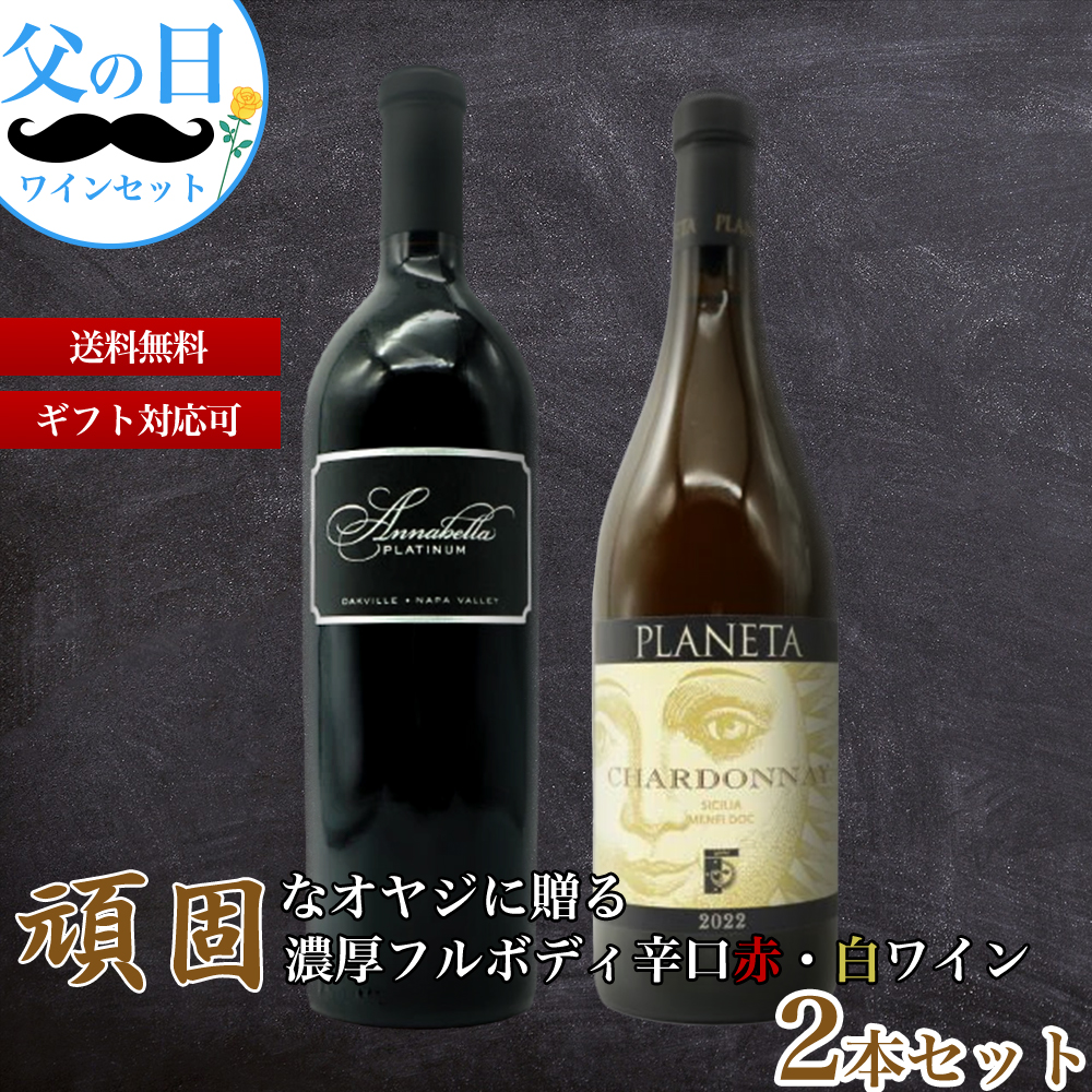 【商品名】【送料無料】頑固なオヤジに贈る濃厚フルボディ辛口赤・白ワイン2本セット(父の日ワインセット)【商品説明】父の日は毎日頑張ってくれているお父さんに、ちょっと贅沢なワインセットをいかがですか?普段はチョット照れくさい感謝の言葉も、ワインと一緒に”ありがとう”が伝わります!頑固なオヤジに贈る濃厚フルボディ辛口赤・白ワイン2本セット!らにご希望の方にはギフト箱に入れて無料ラッピングにメッセージカードをお付け致します!頑固なオヤジに贈る濃厚フルボディ辛口赤・白ワイン2本セットの気になる中身は、ナパ・ヴァレーのオークヴィル地区に位置する(あのオーパス・ワンにも近い)大注目ワイナリー!オーナー&ワインメーカーはマイケル・ポザーン氏!「ナパ・ヴァレーの1級」と評価されているオークヴィルの超厳選カベルネ・ソーヴィニヨン100%をフレンチオークとアメリカンオークの小樽で22ヶ月熟成で造られる究極フルボディ辛口赤ワインが1本!今や、シチリア州でNo.1のトレビッキエーリ獲得数を誇り、国内外で絶大な人気を誇るワイナリー「プラネタ」!国際品種であるシャルドネ種を使って世界のワインと対等に戦うワインを造るという夢から生まれた!シチリア島の北西部サンブーカ・ディ・シチリアにあるウルモとマロッコリの畑(標高100-250mの畑)からの極上シャルドネ100%を発酵と熟成はそれぞれ225Lのフレンチバリック(半分は新樽/半分は1年使用した樽)で造られる究極フルボディ辛口白ワイン!レストラン様をはじめ愛好家から絶大な人気を誇るプラネタ・シャルドネが1本の頑固なオヤジにお薦めの濃厚フルボディ辛口赤・白ワイン2本セット!ワインと一緒に“日頃のありがとう”の気持ちをお届けしませんか。今なら送料無料でお届け致します!(ギフト箱、無料ラッピング、メッセージカードをご希望の方は備考欄にご記載お願いします)