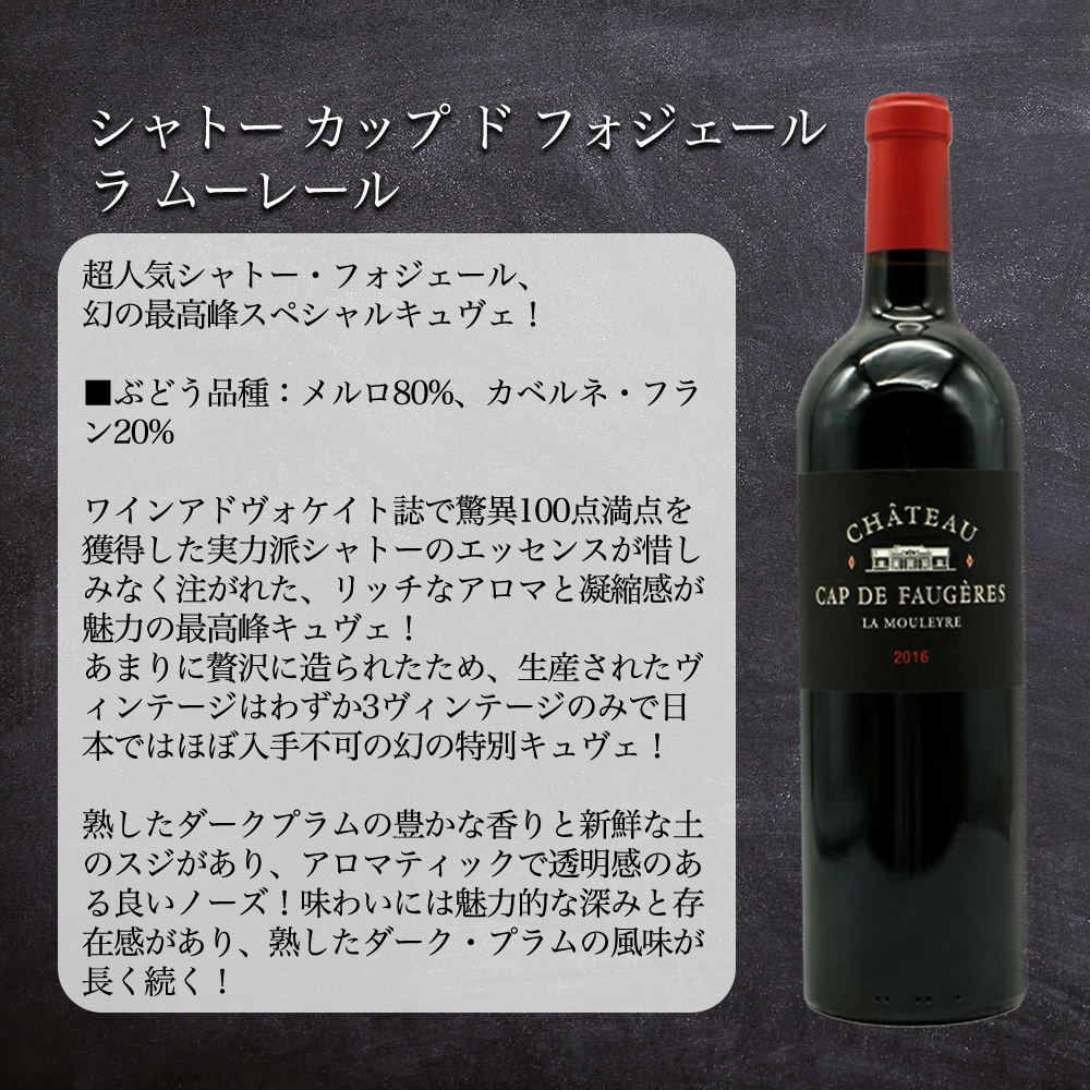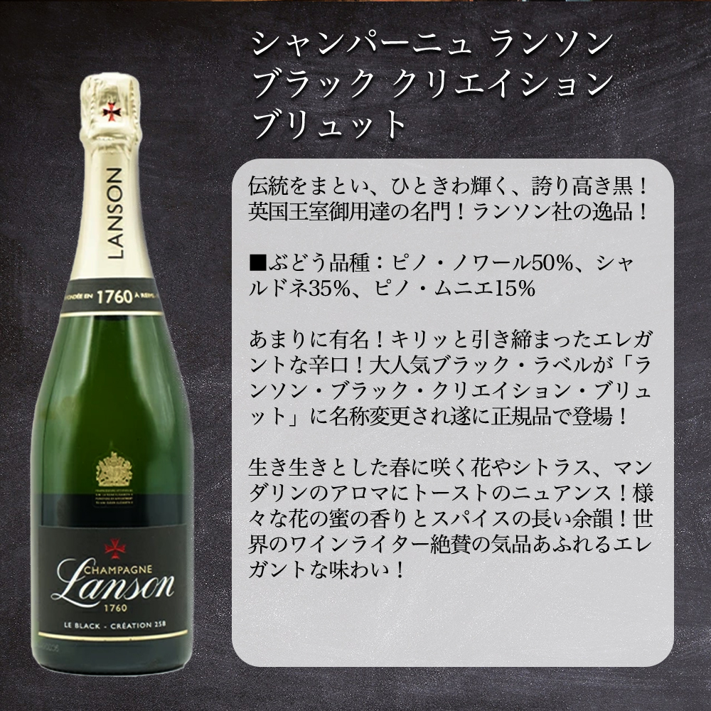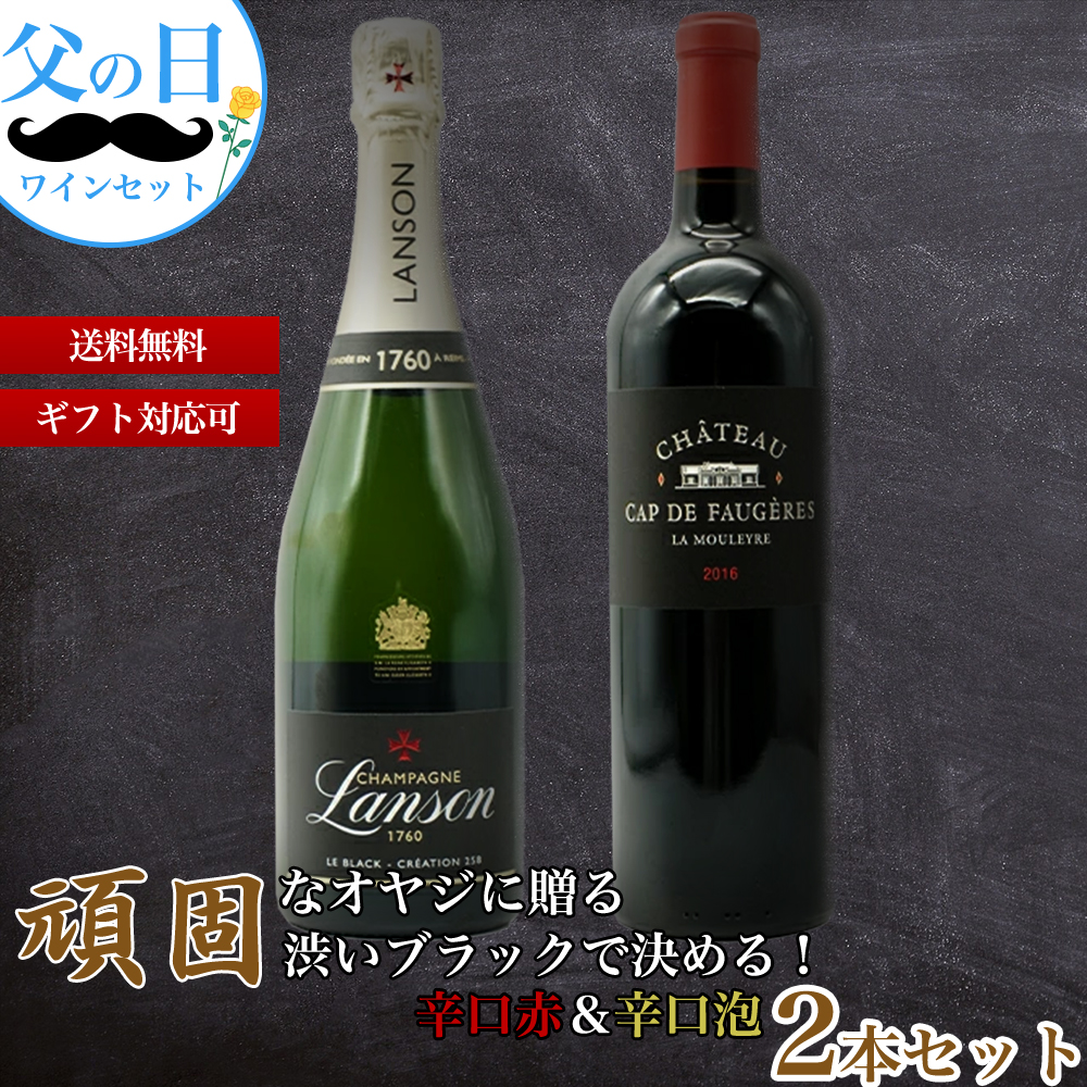 【商品名】【送料無料】頑固なオヤジに贈る渋いブラックで決める!辛口赤&辛口泡2本セット(父の日ワインセット)【商品説明】父の日は毎日頑張ってくれているお父さんに、ちょっと贅沢なワインセットをいかがですか?普段はチョット照れくさい感謝の言葉も、ワインと一緒に”ありがとう”が伝わります!頑固なオヤジに贈る渋いブラックで決める!辛口赤&辛口泡2本セット!さらにご希望の方にはギフト箱に入れて無料ラッピングにメッセージカードをお付け致します!頑固なオヤジに贈る濃厚フルボディ辛口赤ワイン2本セットの気になる中身は、あの名門中の名門!英国王室御用達!の名門ランソン社の逸品!あまりに有名!キリッと引き締まったエレガントな辛口!シャンパーニュ・ランソンのテーマは「A FRESH TOUCH OF LOVE」。ランソンでは、テロワールや人に対する「愛」を持ち続けることを大切にしています。愛は当たり前のものではない、というのがランソンの考えです。愛を持ち続けるためには、常に新鮮(FRESH)な気持ちで愛を更新することが必要だとの思いでワイン造りを行っています。様々な花の蜜の香りとスパイスの長い余韻!世界のワインライター絶賛の気品あふれるエレガントな味わい!新しく生まれ変わったランソン・ブラック・クリエイション・ブリュットが1本!サンテミリオンで人気も実力ともに確固たる地位を築いたグラン・クリュのシャトー・フォジェールの地続きのコート・ド・カスティヨンの区画から造られる、豊かな果実味と力強さを併せ持つ人気フルボディ赤ワイン!シャトー・カップ・ド・フォジェールの超グレートヴィンテージの幻の最高峰スペシャル・キュヴェ!日本ではほぼ入手不可のスペシャルキュヴェ!しかも2014、2015、2016年の3ヴィンテージのみしか世に存在しません!重厚ボトルで偉大なヴィンテージ2016年!まさにワイン愛好家垂涎のカップ・ド・フォジェール“ラ・ムーレール”(黒ラベル)が1本の頑固なオヤジに贈る渋いブラックで決める!辛口赤&辛口泡セット!ワインと一緒に“日頃のありがとう”の気持ちをお届けしませんか。今なら送料無料でお届け致します!(ギフト箱、無料ラッピング、メッセージカードをご希望の方は備考欄にご記載お願いします)