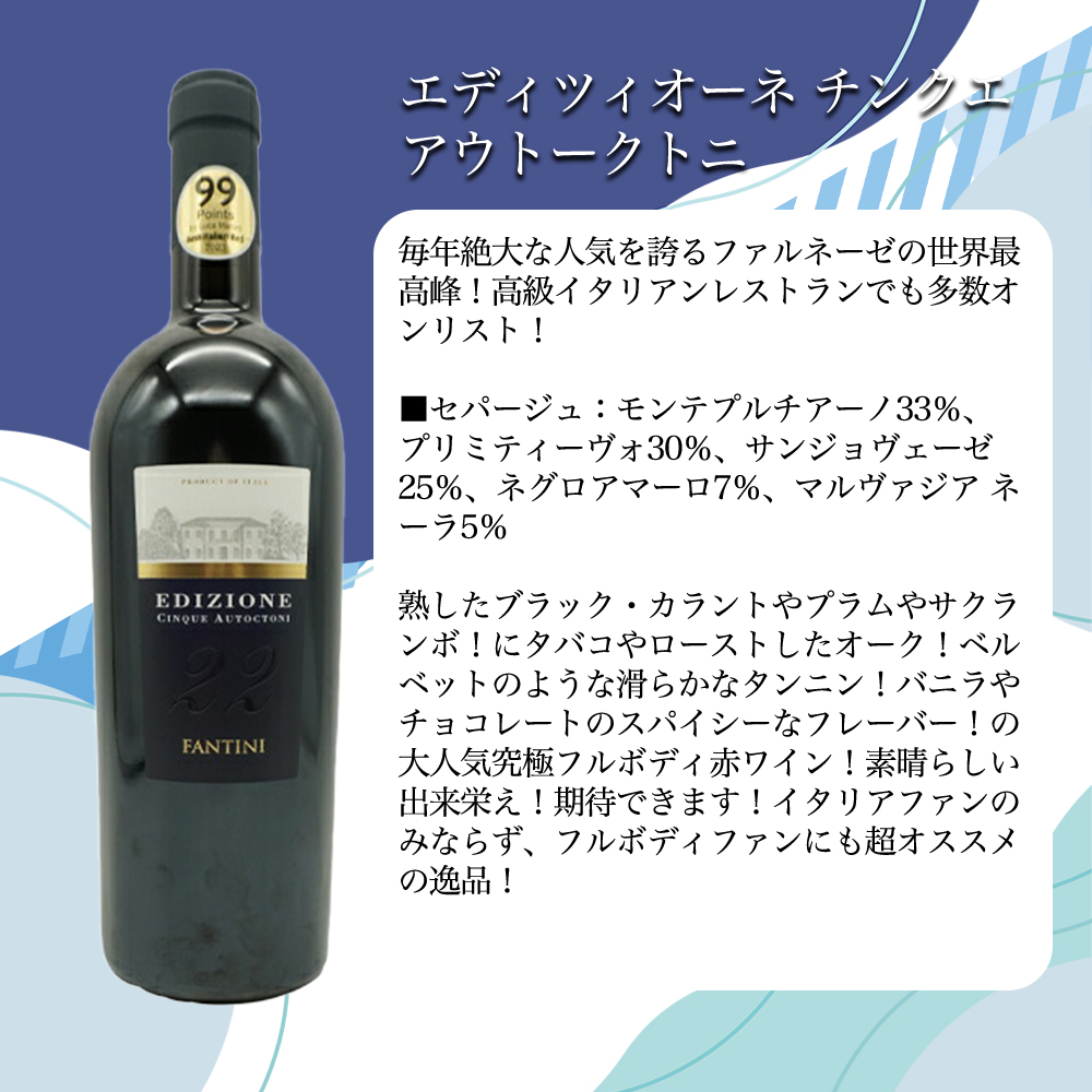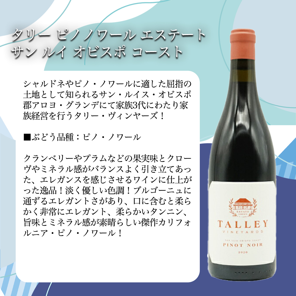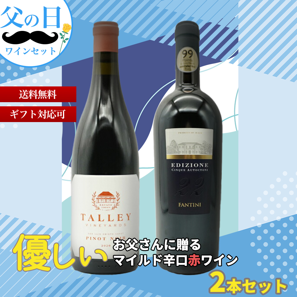 【商品名】【送料無料】優しいお父さんに贈るマイルド辛口赤ワイン2本セット(父の日ワインセット)【商品説明】父の日は毎日頑張ってくれているお父さんに、ちょっと贅沢なワインセットをいかがですか?普段はチョット照れくさい感謝の言葉も、ワインと一緒に”ありがとう”が伝わります!優しいお父さんに贈るマイルド辛口赤ワイン2本セット!さらにご希望の方にはギフト箱に入れて無料ラッピングにメッセージカードをお付け致します!優しいお父さんに贈るマイルド辛口赤ワイン2本セットの気になる中身は、毎年絶大な人気を誇るファルネーゼの最高峰ワイン!「最高」を求め造りあげた至極ワイン!熟したブラック・カラントやプラムやサクランボ!にタバコやローストしたオーク!ベルベットのような滑らかなタンニン!バニラやチョコレートのスパイシーなフレーバーの大人気究極フルボディ赤ワイン!エディツィオーネ・チンクエ・アウトークトニが1本!2006年の第3回米仏ブラインド対決「メモリアルマッチ」でカリフォルニア部門にて優勝!名声を揺るぎないものにした銘醸“タリー”!ずばり名門タリー・ヴィンヤーズが誇る高級エステートもの!3つの有名な自社畑、リンコン・ヴィンヤードとローズマリーズ・ヴィンヤード、ストーン・コラル・ヴィンヤードのピノ・ノワールをブレンド!ブルゴーニュに通ずるエレガントさがあり、口に含むと柔らかく非常にエレガント、柔らかいタンニン、旨味とミネラル感が素晴らしい傑作カリフォルニア・ピノ・ノワールが1本の優しいお父さんに贈るマイルド辛口赤ワイン2本セット!ワインと一緒に“日頃のありがとう”の気持ちをお届けしませんか。今なら送料無料でお届け致します!(ギフト箱、無料ラッピング、メッセージカードをご希望の方は備考欄にご記載お願いします)