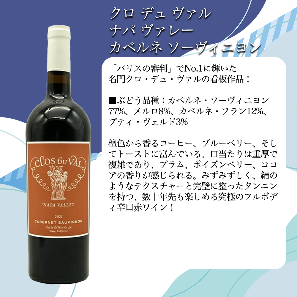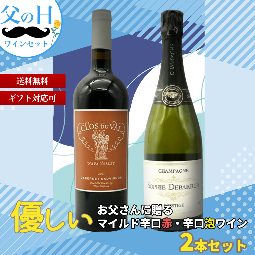 【商品名】【送料無料】優しいお父さんに贈るマイルド辛口赤・辛口泡ワイン2本セット(父の日ワインセット)【商品説明】父の日は毎日頑張ってくれているお父さんに、ちょっと贅沢なワインセットをいかがですか?普段はチョット照れくさい感謝の言葉も、ワインと一緒に”ありがとう”が伝わります!優しいお父さんに贈るマイルド辛口赤・辛口泡ワイン2本セット!さらにご希望の方にはギフト箱に入れて無料ラッピングにメッセージカードをお付け致します!優しいお父さんに贈るマイルド辛口赤・辛口泡ワイン2本セットの気になる中身は、あのシャトー・ムートン・ロートシルトやシャトー・オーブリヨンを凌駕し、No.1に輝いたことで有名なクロ・デュ・ヴァル!1976年にパリで開かれた権威あるワイン品評会(有名な「パリスの審判」)でその品質を認められて以来、ナパ・ヴァレーを代表するワイナリーとしての地位を保ち続けています!2016年より品質も大幅にランクアップし、エステート・シリーズとしてリリース!「全てを兼ね備えたワイン。紫檀色から香るコーヒー、ブルーベリー、そしてトースト。口当たりは重厚にして複雑、プラム、ポイズンベリー、ココアの香りが溢れ出します。みずみずしく、絹のようなテクスチャーと完璧に整ったタンニンは今飲むことができますが、数十年先を楽しむことができるワインです。」高級ナパ・カベルネが1本!生産は家族と親戚筋のみのスタッフがわずか14名で造られるまさに手造りともいえるシャンパーニュ!1947年からオーブ県のコート・ド・バールはセル・シュール・ウルス本拠地のレコルタン・マニュピュラン!キンメリジャン土壌の厳選ピノ・ノワール50%にシャルドネ50%の黄金比率!マロラクティック発酵有!驚異の熟成期間30ヶ月熟成の本格派!ドサージュ5g/Lの本格派辛口!澄んだゴールデンカラーをまとい、きめ細やかな泡立ち、白いフルーツを思わせるようなフレッシュな香りに、黄色の花やほのかな草の香り、カシス、シナモン、キャラメルの複雑な香り、白桃やリンゴなどの果実の芳醇な味わいが広がります!フレッシュ、そしてエレガントで奥行のある究極シャンパーニュが1本の優しいお父さんに贈るマイルド辛口赤・辛口泡ワイン2本セット!ワインと一緒に“日頃のありがとう”の気持ちをお届けしませんか。今なら送料無料でお届け致します!(ギフト箱、無料ラッピング、メッセージカードをご希望の方は備考欄にご記載お願いします)