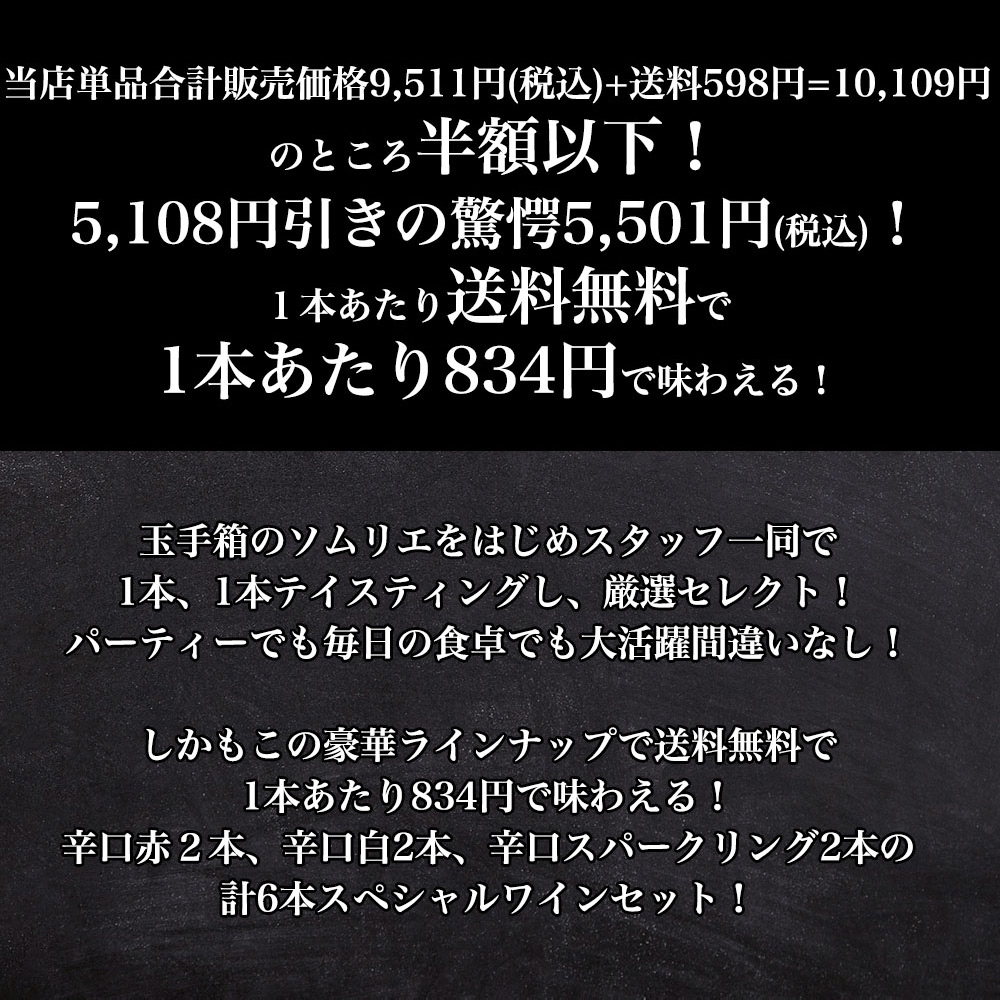 【商品説明】うきうきワインの玉手箱スペシャルセレクション赤・白・泡6本飲み比べワインセットが遂に誕生! 玉手箱のソムリエをはじめスタッフ一同で1本、1本テイスティングし、厳選セレクト!パーティーでも毎日の食卓でも大活躍間違いなし!しかもこの豪華ラインナップで送料無料で1本あたり834円で味わえる!辛口赤2本、辛口白2本、辛口スパークリング2本の計6本スペシャルワインセット! ボルドーAOCのワンランク上の高級規格!AOCボルドー・シュペリュールのフルボディ辛口赤ワインの三冠ゴールドメダル金賞受賞酒が1本! 一度絶滅したとされていましたが、ロンガネージ家という農家の畑に一本だけ古樹が残っており、そこから復活!「奇跡のブドウ」とも呼ばれる、イタリアでも非常に希少なブドウ品種で固有品種ロンガネージ種100%で造られる極旨フルボディ辛口赤ワインが1本! “ラングドックのベェネツィア”と呼ばれるセット(Sete)の近くで古くから栽培される“ピクプール”という土着品種で造られる地中海生まれのコスパ抜群のすっきり辛口白ワインが1本! マルケ州のリーダー!大人気ウマニ・ロンキが自社畑100%!ヴェルディッキオ種100%で造る、ワンランク上のクラッシコ規格!フレッシュでフルーティーで豊かな香り!辛口の味わいで、アーモンドを思わせる!ヴェルディッキオらしいアフターに感じるビターがたまらなく素晴らしい究極白ワインが1本! シャンパーニュと同じ土壌を持ち、ブドウ栽培に適した畑として知られる、地中海を望むスペイン・カタルーニャ地方ペネデスの地で造られる、シャンパーニュと同じ瓶内2次発酵方式で造られるスペイン(高級シャンパン方式で造られる)高級カバ!しかもカヴァの中でも最辛口に分類されるブリュット・ナチュール(補糖なし)が1本! 1930年代、ペルリーノファミリーの情熱と不屈の精神により、イタリアのスパークリング業界で大成功!独自のノウハウと専門性を進化させ、ブドウ畑から消費者まで、製造の各ステップにおける商品の品質を知り尽くした熟練者ペルリーノの究極スプマンテ!その名も「ソー・ハッピー」!ちょっと良いことがあった時、お祝い気分の時など、皆さんの毎日をハッピーに!日常に喜びをもたらす、フレッシュでフルーティなデイリー・スプマンテが1本の計6本! 当店単品合計販売価格9,511円(税込)+送料598円=10,109円のところ半額以下! 5,108円引きの驚愕5,501円(税込)!1本あたり送料無料で1本あたり834円で味わえる! パーティーでも毎日の食卓でも大活躍違いなしの豪華スペシャル赤・白・泡飲み比べセット!