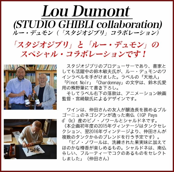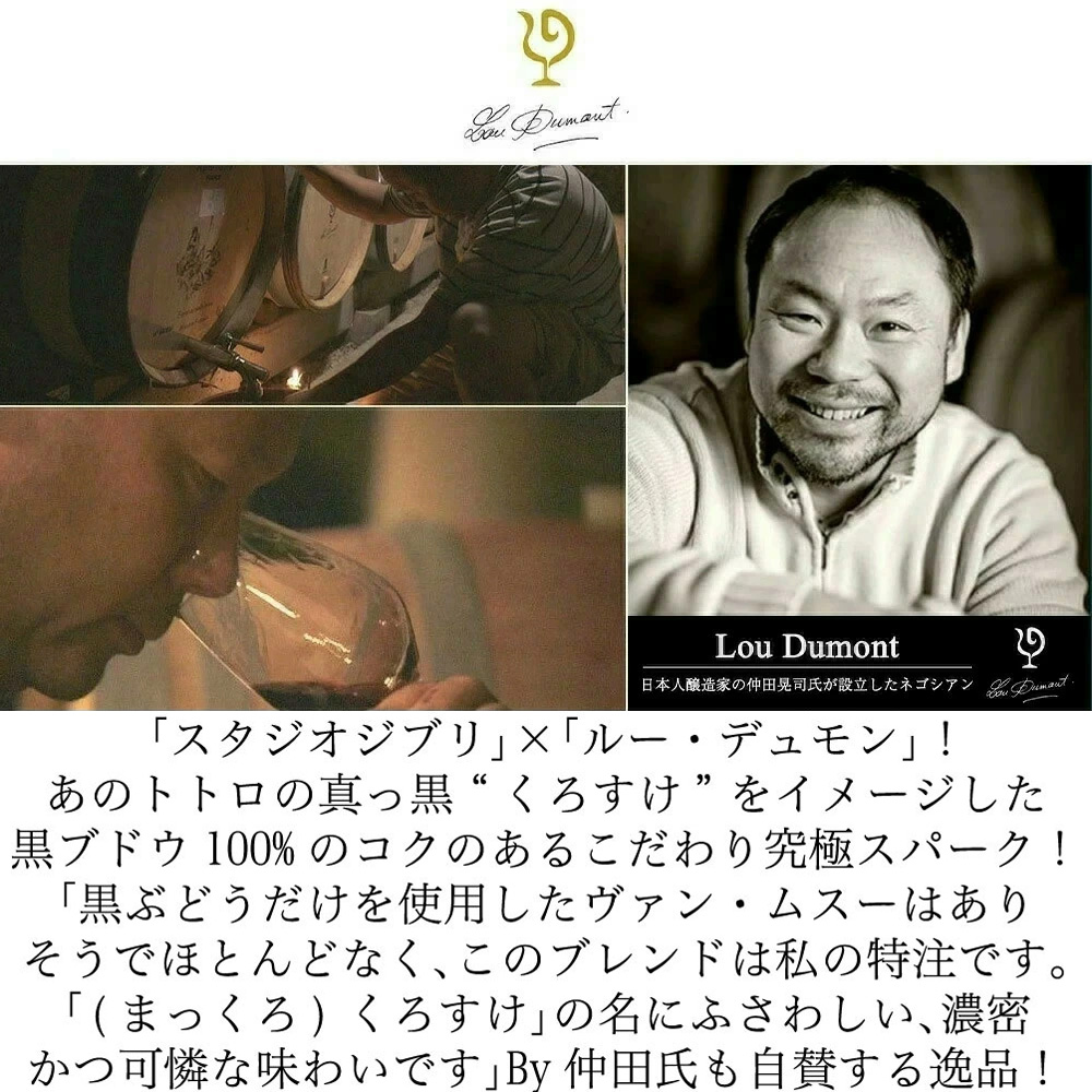 【商品説明】日本のワイン愛好家大注目!ジブリファン大注目!「スタジオジブリ」×「ルー・デュモン」!鈴木敏夫プロデューサーと仲田晃司のコラボレーション!あのトトロの真っ黒“くろすけ”をイメージした黒ブドウ100%のコクのある辛口ブラン・ド・ノワール・スパークリング白ワイン!造り手はワイン愛好家なら知らない人はいない、日本人でありながらジュヴレ・シャンベルタン村に住み、「日本人であるということ」と「自然と人間に対する真摯な畏敬の念」を抱きながら細部にまで徹底したワイン造りに取り組むルー・デュモンの仲田氏!この度、スタジオジブリのプロデューサーであり書家としても活躍中の鈴木敏夫氏が、仲田晃司氏プロデュースのワインラベルを手がけました!ラベルの「天地人」「cuvee kurosuke」の文字は鈴木氏愛用の熊野筆にて書き下ろし、ラベル右下の落款は、アニメーション映画監督・宮崎駿氏によるデザイン!仲田氏の友人が醸造長を務めるブルゴーニュのネゴシアンが造った3ヶ月間のロング・シャルマ方式によるスパークリング白ワインです!ボージョレ北部のランシエ村産のガメイ95%、ヴィドック5%のブレンド。砂質土壌。樹齢10~30年。ステンレスタンクで醸造!MCR(濃縮ぶどう果汁)によるドザージュは5g/l。「ヴィドックはフランス国立農業食品環境研究所(INRAE)が開発した新品種で、フルーティーなガメイに骨格と複雑味を与えています。いくつか試飲した中でこのアサンブラージュがずば抜けて美味しかったため、2代目キュヴェ・クロスケに採用しました。「(まっくろ)くろすけ」の名にふさわしい、濃密かつ可憐な味わいです」。By仲田氏!こだわりのスパークリングワインが限定で少量入荷!