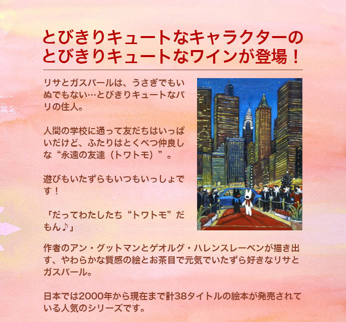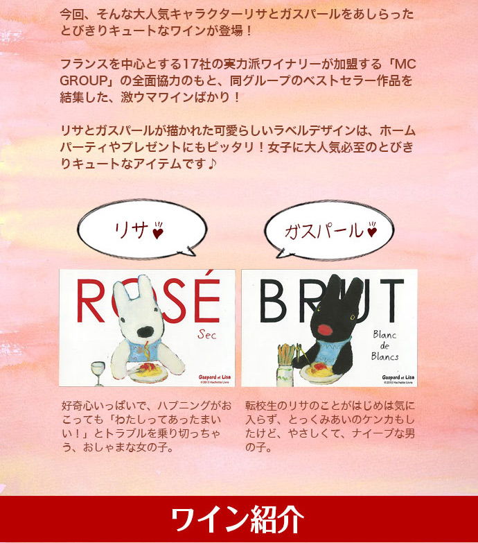 【商品説明】辛口・ロゼワイン愛好家必見!!フランス発!パリのエスプリを感じる人気キャラクター!!世界中で愛されるとびきりキュートなパリの住人!!“リサとガスパール”がとびきりキュートなワインになった!!大人気のロゼの辛口スパークリングワイン入荷!! 華やかな色合いと泡立ちが楽しめるロゼ・スパークリング!ラズベリーやイチゴのようなチャーミングな味わいで果実本来のフルーティでフレッシュな甘みが余韻に広がる魅力の辛口・ロゼワイン! フルーティーで果実味豊かな辛口に仕上げられているので、ワイン初心者にもオススメの逸品!!まさに好奇心いっぱいでおしゃまな女の子、リサのようなキュートな辛口・ロゼワイン!!ギフトはもちろん、パーティーや女子会など大人数で楽しむのにもぴったりな大人気辛口・ロゼワイン!!ぜひご賞味下さい!!