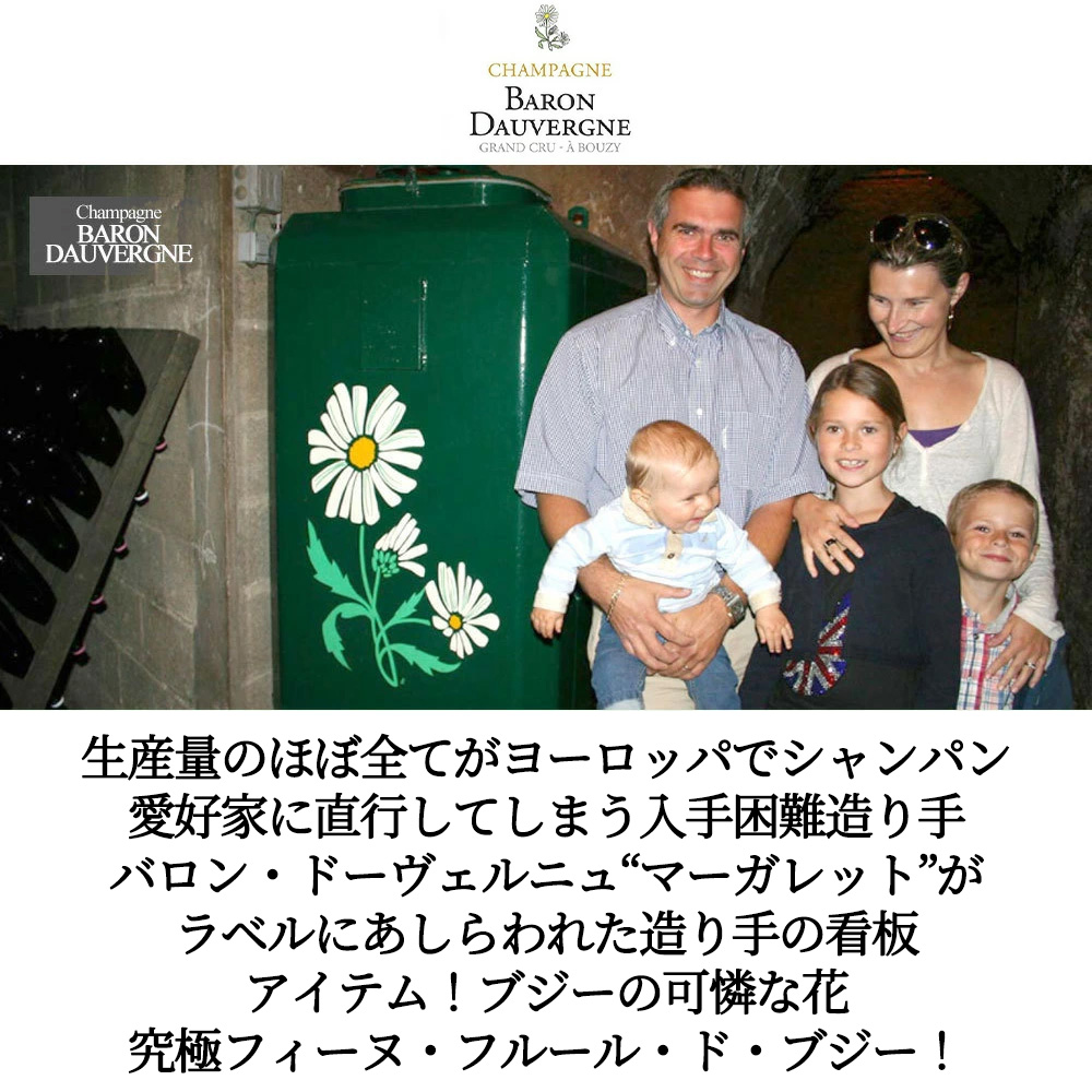 【商品説明】超希少!シャンパーニュ愛好家垂涎!作柄の良い年のみに限定(わずか400ケースのみ)生産される超入手困難シャンパーニュ!その名もフィーヌ・フルール・ド・ブジー「ブジーの可憐な花」!ラベルにプリントされている白い花は、シャンパーニュ地方のシンボルの花“マーガレット”! 造り手のユベール・ドーヴェルニュはモンターニュ・ド・ランスのブジー村に4代続く造り手!所有する畑のなんとすべてがブジー・グラン・クリュ(特級)という名門中の名門!年間総生産量は3000ケースあまりという少なさで、職人的なこだわりを持つ極上シャンパーニュ!なんと現当主ヴァンサン・ドーヴェルニュのポリシーは「単一品種・単一区画・単一ミレジム」という、シャンパーニュ愛好家だけでなくブルゴーニュ生産者でさえ涙ものの醍醐味! しかもこのフィーヌ・フルール・ド・ブジーは、ブジー産100%のグラン・クリュ畑のさらに最優良区画(単一畑)のピノ・ノワール100%のブラン・ド・ノワール!生産量のほぼ100%がヨーロッパのシャンパン愛好家に直行!わずかな数量のみフランスとベルギーのレストランと日本他で入手! まさに幻のシャンパーニュが元詰で、しかも現地のセラー数ヶ月前の蔵出しで超限定入荷!