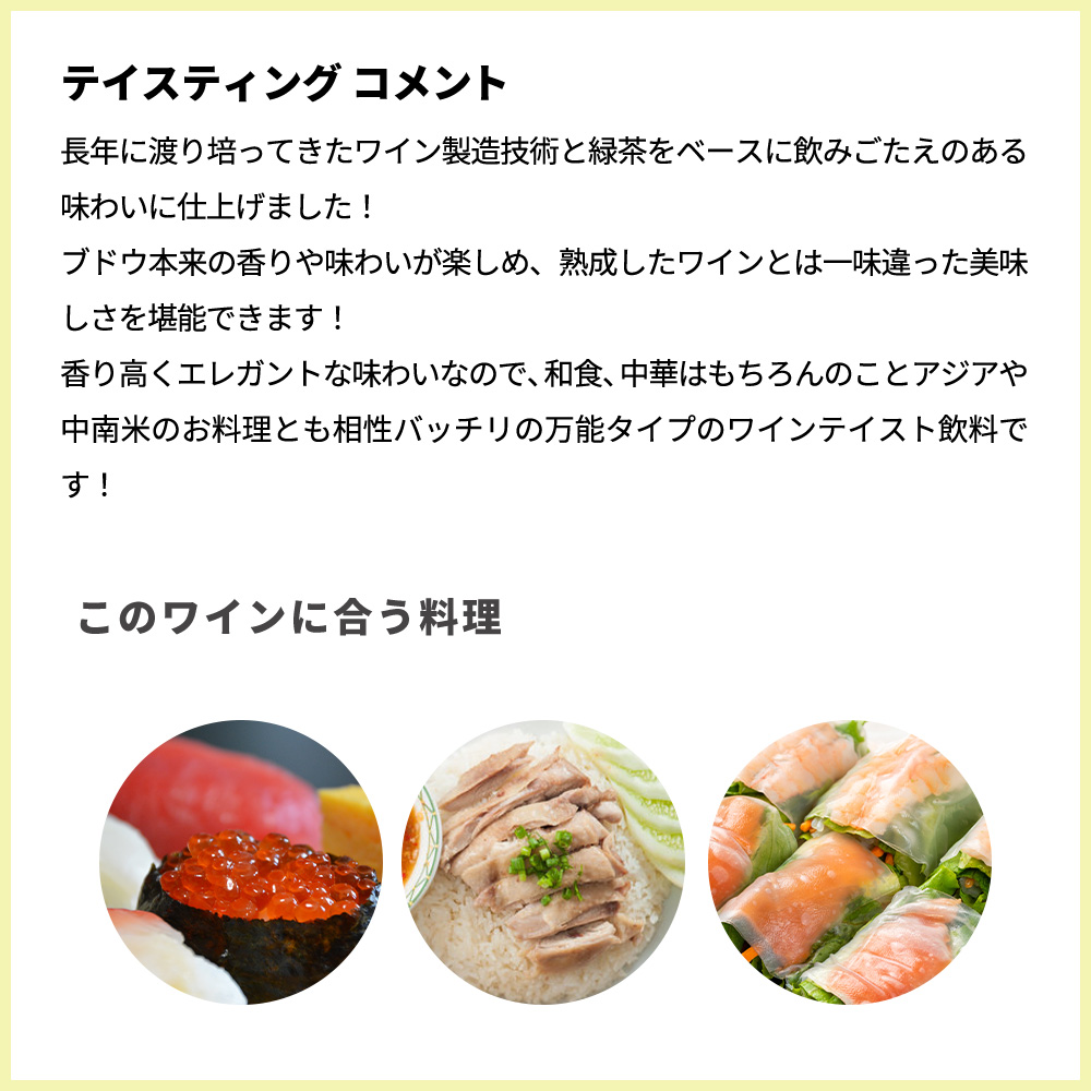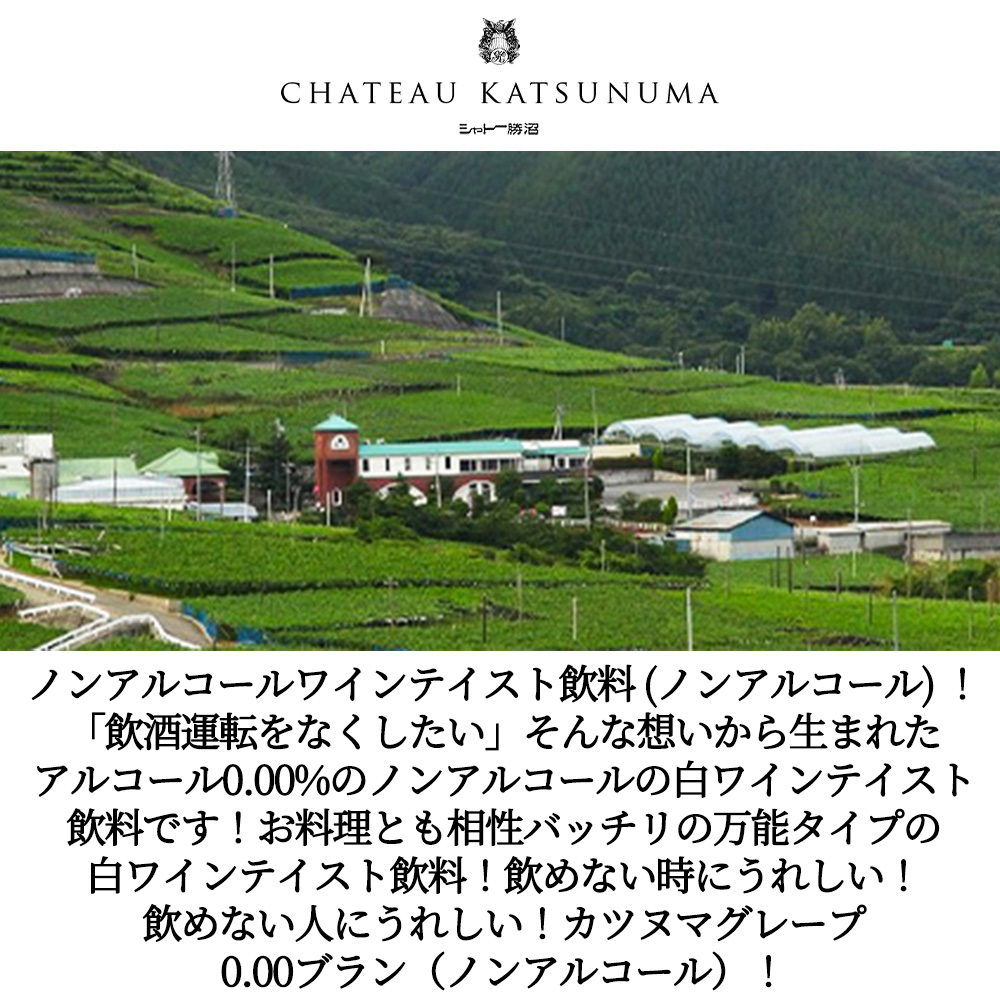 【商品説明】今、爆発人気!ノンアルコール白ワインテイスト飲料 (ノンアルコール) 白ブドウ (シャルドネ種、シュナンブラン種、甲州種から) 愛好家大注目!「飲酒運転をなくしたい」そんな想いから生まれたアルコール0.00%のノンアルコールの白ワインテイスト飲料です!飲めない時にうれしい!飲めない人にうれしい! (カツヌマグレープ(ノンアルコール)ブランは、アルコールを生成しない特許製法で「アルコール0.00%」のワインテイストの飲料を開発しました!長年に渡り培ってきたワイン製造技術と緑茶をベースに飲みごたえのある味わいに仕上げました! 【料理との相性】ブドウ本来の香りや味わいが楽しめ、熟成したワインとは一味違った美味しさを堪能できます!香り高くエレガントな味わいなので、和食、中華はもちろんのことアジアや中南米のお料理とも相性バッチリの万能タイプのワインテイスト飲料です!