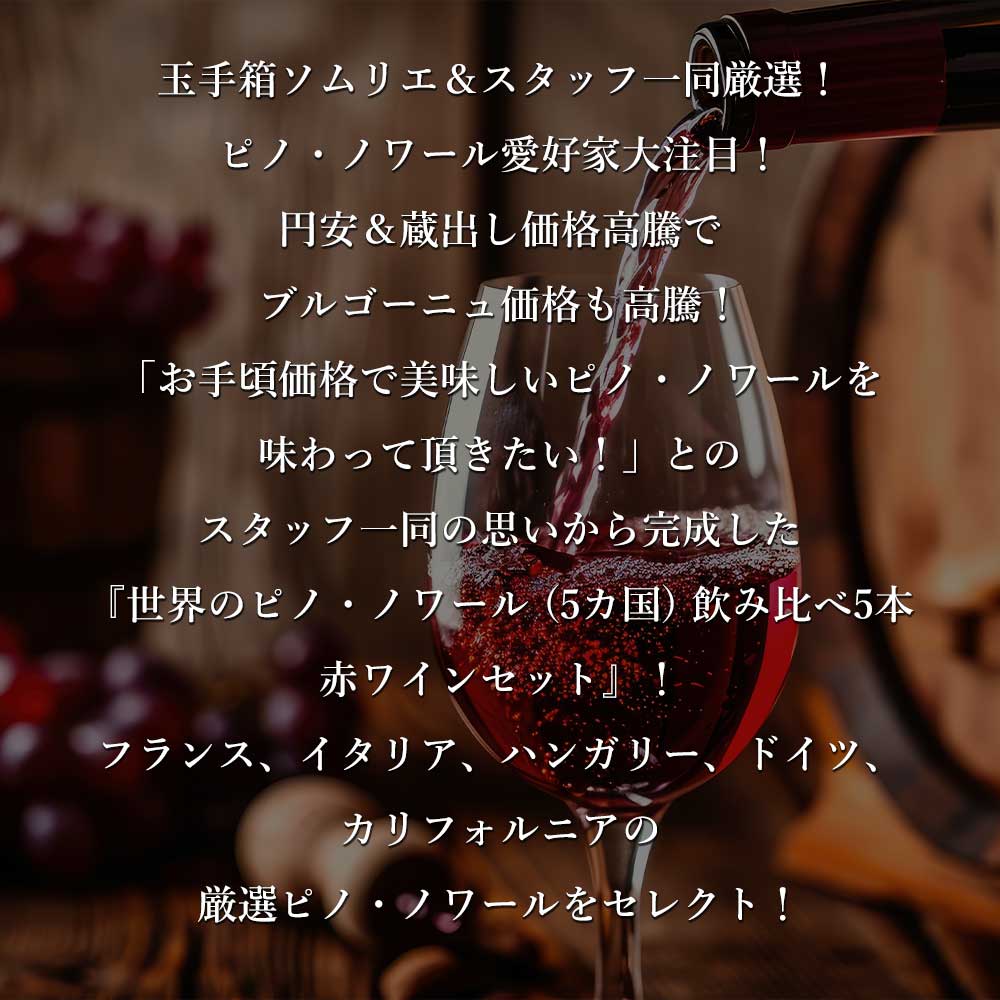 【商品名】【送料無料】 うきうきワインの玉手箱厳選!世界のピノ ノワール (5カ国) 飲み比べ5本赤ワインセット ワイン ワインセット【商品説明】玉手箱ソムリエ&スタッフ一同厳選!ピノ・ノワール愛好家大注目!円安&蔵出し価格高騰でブルゴーニュ価格も高騰!「お手頃価格で美味しいピノ・ノワールを味わって頂きたい!」とのスタッフ一同の思いから完成した『世界のピノ・ノワール (5カ国) 飲み比べ5本赤ワインセット』!フランス、イタリア、ハンガリー、ドイツ、カリフォルニアの厳選ピノ・ノワールをセレクト! 中身は、1954年設立のワイナリーで、1780年創業のネゴシアン、パトリアッシュ社の傘下にあるワイナリー!クーヴァン・デ・ヴィジタンディーヌによる厳選ピノ・ノワール100%をステンレスタンク醗酵!80%ステンレスタンク熟成、20%オーク樽熟成(仏産、228L)で造られる本格派ブルゴーニュ・ピノ・ノワールが1本! 今やロマーニャ全域のワインを製造するイタリアを代表する会社となったCE.VICO社!ピノ・ネロ(ピノ・ノワール)100%手摘み100%で造られたイタリア産ピノ・ノワール!渋みが控えめでありながらも深みのある味わい!ブルゴーニュのタンニンがしっかりしたものや、ニューワールド系のアルコール度数が高めでフルボディのものとも異なる、親しみやすさを持った仕上がりの極旨辛口赤ワインが1本! 1882年創業のハンガリー国内最大にして最古のワイナリー“トーレイ社”によるハンガリー産ピノ・ノワール!樹齢驚異の30-35年のピノ・ノワール種100%を木樽5~6ケ月熟成で造られる、フレッシュなレッドベリーフルーツにチェリーやラズベリーのニュアンスのクラシックタイプのピノノワール100%辛口赤ワインが1本! ドイツ・ラインヘッセン地方からピノ・ノワール種100%で造られる、エレガントで円やかな味わいが楽しめるドイツ産ピノ・ノワールが1本! 土壌の豊かさを無垢に表現する造り手シーリッジワイナリー!赤系果実の甘酸っぱい香りやベリー類の甘い香りにスパイスのアクセント!全体的にフレッシュながらも、程よく熟れた果実の印象!口当たりは柔らかくフレッシュ!余韻に心地良い酸味とタンニンが続く、親しみやすい味わいのカリフォルニア・ピノが1本の計5カ国(5種)飲み比べ世界のピノ・ノワールセット! パーティーで毎日の食卓で世界のピノ・ノワールの魅力を感じてください!送料無料でお届けします!