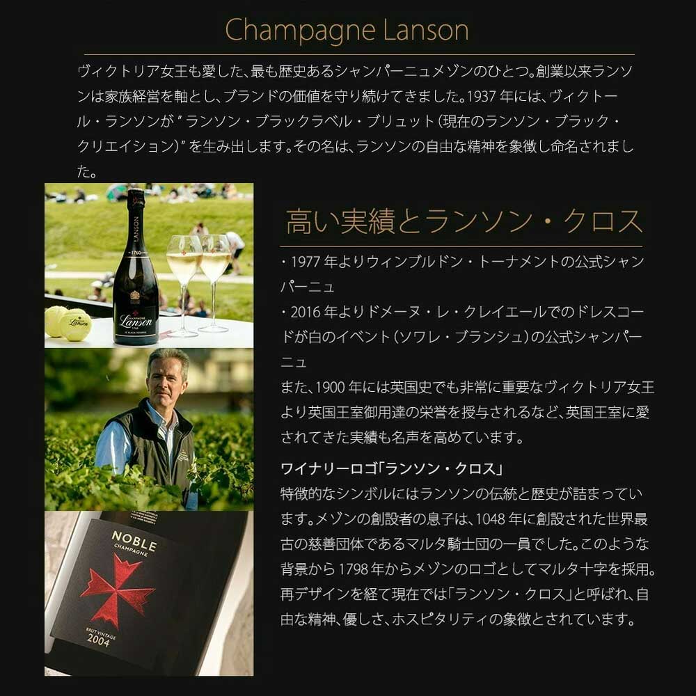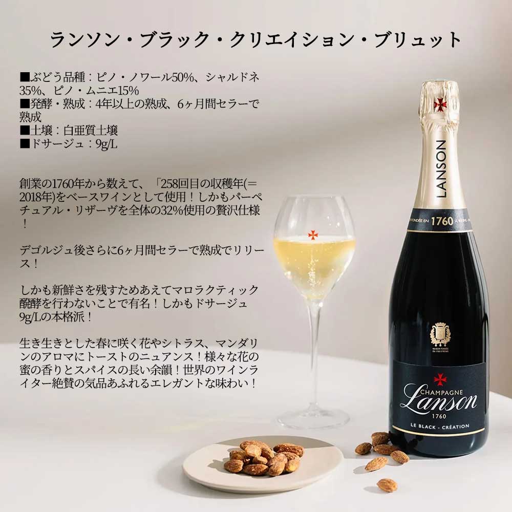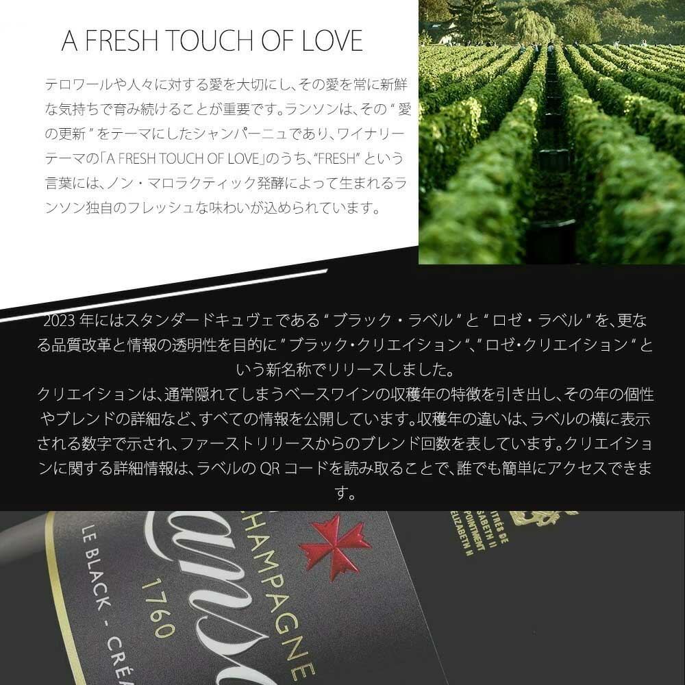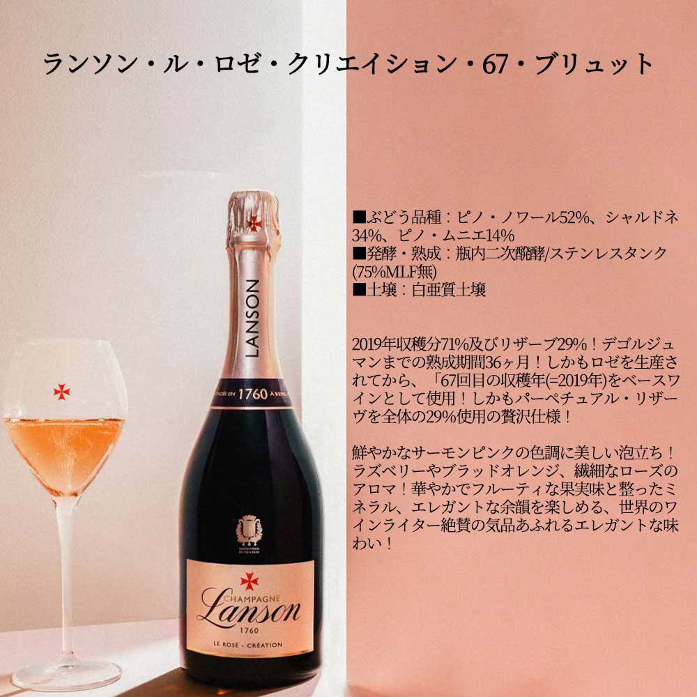 【商品説明】数量限定!ランソンロゴ入りフルートグラス2脚付きの飲み比べセット(ブラック・クリエイション・ブリュットとル・ロゼ・クリエイション・67・ブリュットの飲み比べ)が登場!大人気シャンパーニュ愛好家大注目!あの名門中の名門!英国王室御用達!の名門ランソン社の逸品!あまりに有名!キリッと引き締まったエレガントな辛口!大人気ブラック・ラベルが「ランソン・ブラック・クリエイション・ブリュット」に名称変更され遂に正規品で登場! 一世紀以上もの間、英国王室御用達のシャンパーニュとして王室に愛され続け、また、ウィンブルドン・テニストーナメントの公式シャンパーニュとしても長年にわたり選ばれ続けています!「1760年に創業された最も歴史のあるシャンパーニュ・メゾンの一つ。伝統と独自の専門知識、そしてシャンパーニュ造りへの深い愛情を持ち、最高品質のシャンパーニュの製造に情熱を注いできました。その卓越した品質は世界中のワイン愛好家や専門家から高く評価されています。英国王室御用達のシャンパーニュとして一世紀以上も愛され続けており、ボトルにはその証である英国王室の紋章が刻まれています。王室公式シャンパーニュの栄誉を授与して以来、その称号を一度も失っていない唯一のメゾン。ランソンでは、ノン・マロラクティック醗酵を採用することで、爽やかな酸味とフレッシュでクリーンな口当たりを実現。この製法がランソンのシャンパーニュを特徴づけています。 シャンパーニュ・ランソンのテーマは「A FRESH TOUCH OF LOVE」。ランソンでは、テロワールや人に対する「愛」を持ち続けることを大切にしています。愛は当たり前のものではない、というのがランソンの考えです。愛を持ち続けるためには、常に新鮮(FRESH)な気持ちで愛を更新することが必要だとの思いでワイン造りを行っています。ランソンの特徴であるノン・マロラクティック製法によるフレッシュな味わいは、ランソンの考える「A FRESH TOUCH OF LOVE」そのものです。 最高醸造責任者のエルヴェ・ダンタン氏は、シャンパーニュ地方マルヌ村にワイン生産者の息子として生まれました。ボルドー、アルザス、ブルゴーニュやアメリカで経験を重ねた後、わずか25歳でシャンパーニュのワインメーカーに抜擢。シャンパーニュ・メゾンで22年間にわたってワイン造りの経験を積み、2013年にランソンに最高醸造責任者として加入しました。55ものクリュ別タンクの導入やスタンダード・キュヴェの一新など、ダンタン氏はその情熱と創造性をもって、ランソンに数々の革新をもたらしています。」ランソンはシャンパーニュにおける情報の透明性のパイオニアです!2009年には他メゾンに先駆けてデゴルジュマン日を裏ラベルに記載!2023年には情報の透明性を体現する取り組みの一つとして“クリエイション・シリーズ” を開始!スタンダードキュヴェにもQRコードを通じて収穫年の情報や産地情報など非常に細かい情報を提供しています! 「ランソン・ブラック・クリエイション・ブリュット」は、白亜質土壌からのピノ・ノワール50%、シャルドネ35%、ピノ・ムニエ15%(特級&1級畑比率50%以上)を最低でも驚異の4年以上の熟成!しかも創業の1760年から数えて、「258回目の収穫年(=2018年)をベースワインとして使用!しかもパーペチュアル・リザーヴを全体の32%使用の贅沢仕様!デゴルジュ後さらに6ヶ月間セラーで熟成でリリース!(クリエイションは、通常隠れてしまうベースワインの収穫年の特徴を引き出し、その年の個性やブレンドの詳細など、すべての情報を公開しています。収穫年の違いは、ラベルの横に表示される数字で示され、ファーストリリースからのブレンド回数を表しています。クリエイションに関する詳細情報は、ラベルのQRコードを読み取ることで、誰でも簡単にアクセスできます。)しかも新鮮さを残すためあえてマロラクティック醗酵を行わないことで有名!しかもドサージュ9g/Lの本格派!生き生きとした春に咲く花やシトラス、マンダリンのアロマにトーストのニュアンス!様々な花の蜜の香りとスパイスの長い余韻!世界のワインライター絶賛の気品あふれるエレガントな味わい! 「ランソン・ル・ロゼ・クリエイション・67・ブリュット」は、白亜質土壌(約45%がグランクリュ&プルミエクリュ)からのピノ・ノワール52%、シャルドネ34%、ピノ・ムニエ14%を瓶内二次醗酵/ステンレスタンク(75%MLF無)!2019年収穫分71%及びリザーブ29%!デゴルジュマンまでの熟成期間36ヶ月!しかもロゼを生産されてから、「67回目の収穫年(=2019年)をベースワインとして使用!しかもパーペチュアル・リザーヴを全体の29%使用の贅沢仕様!鮮やかなサーモンピンクの色調に美しい泡立ち!ラズベリーやブラッドオレンジ、繊細なローズのアロマ!華やかでフルーティな果実味と整ったミネラル、エレガントな余韻を楽しめる、世界のワインライター絶賛の気品あふれるエレガントな味わい! ランソン社の看板ブリュットとロゼ・ブリュッ