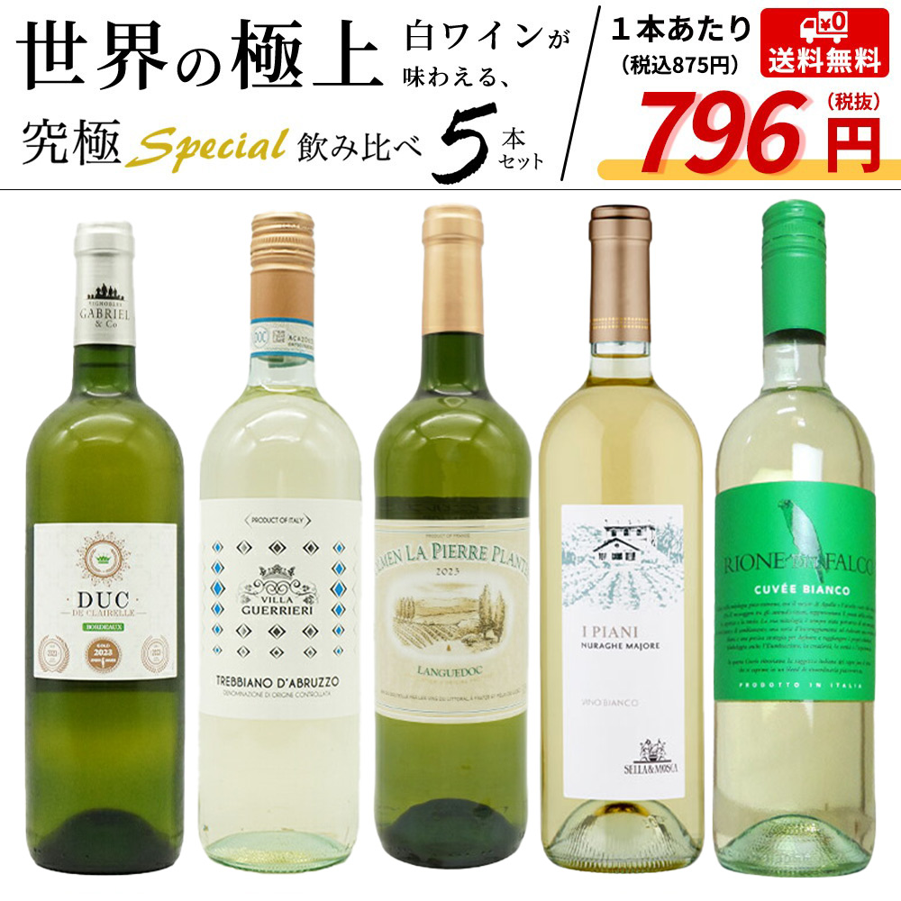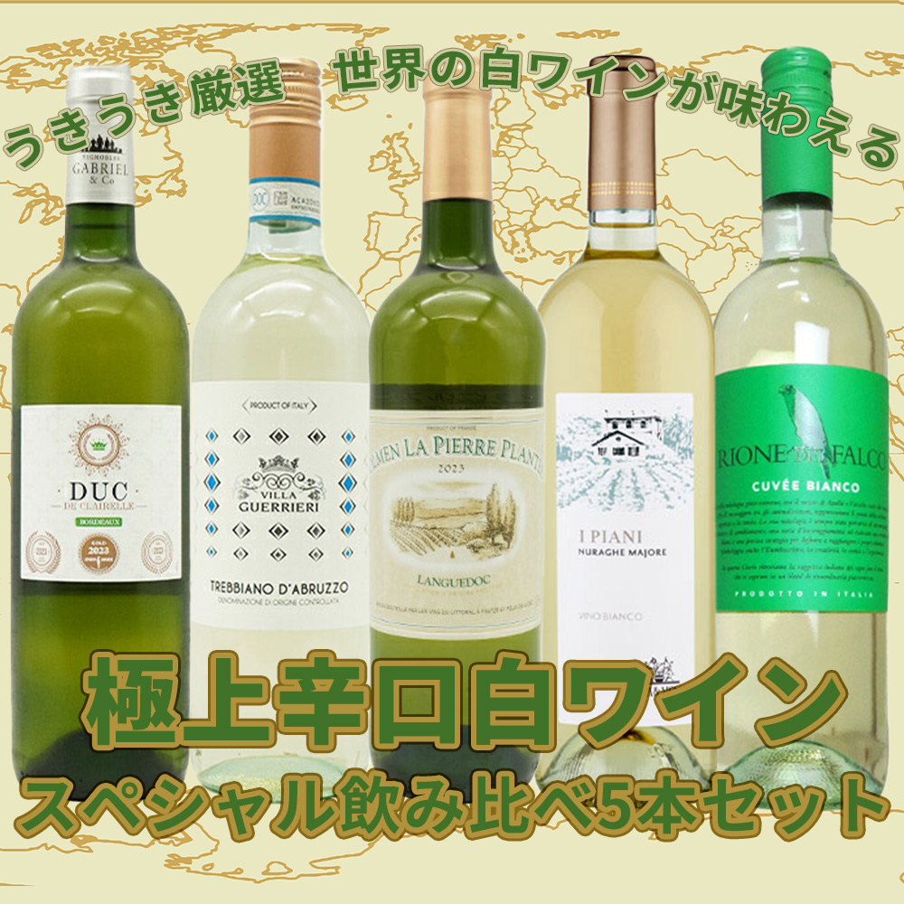 【商品名】【送料無料】当店厳選!世界の白ワインが味わえる!超極上辛口白ワイン究極スペシャル飲み比べ5本セット【商品説明】辛口白ワインファン大注目!当店玉手箱超厳選!ブルゴーニュ、スペイン、チリ、イタリア等、世界を代表するワイン産地から、当店ソムリエ、スタッフが厳選!えりすぐりの大人気スペシャル辛口白ワインばかりの究極辛口白ワイン5本セット!究極辛口白ワイン5本セットが1本当たり876円(税込)で味わえる!レストラン様にも超オススメ!ずばりスペシャル価格でご案内!しかも太っ腹!宅配料無料!当店超自信の究極辛口白ワインセットをこの機会に是非お試しください!