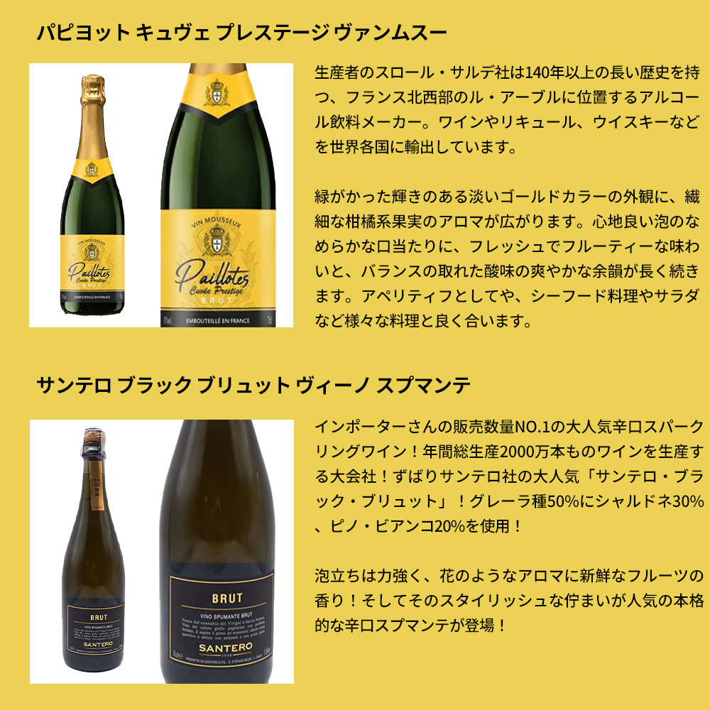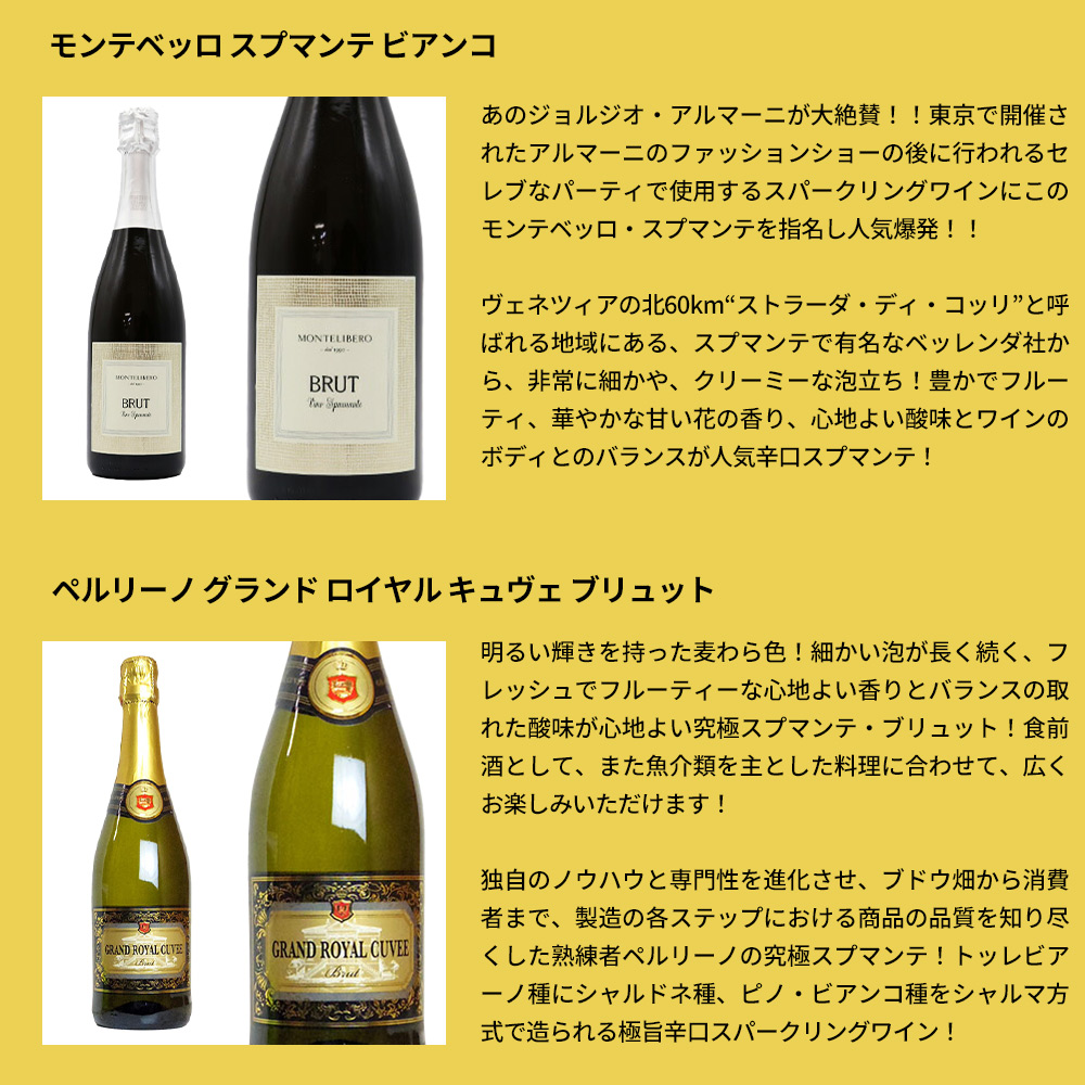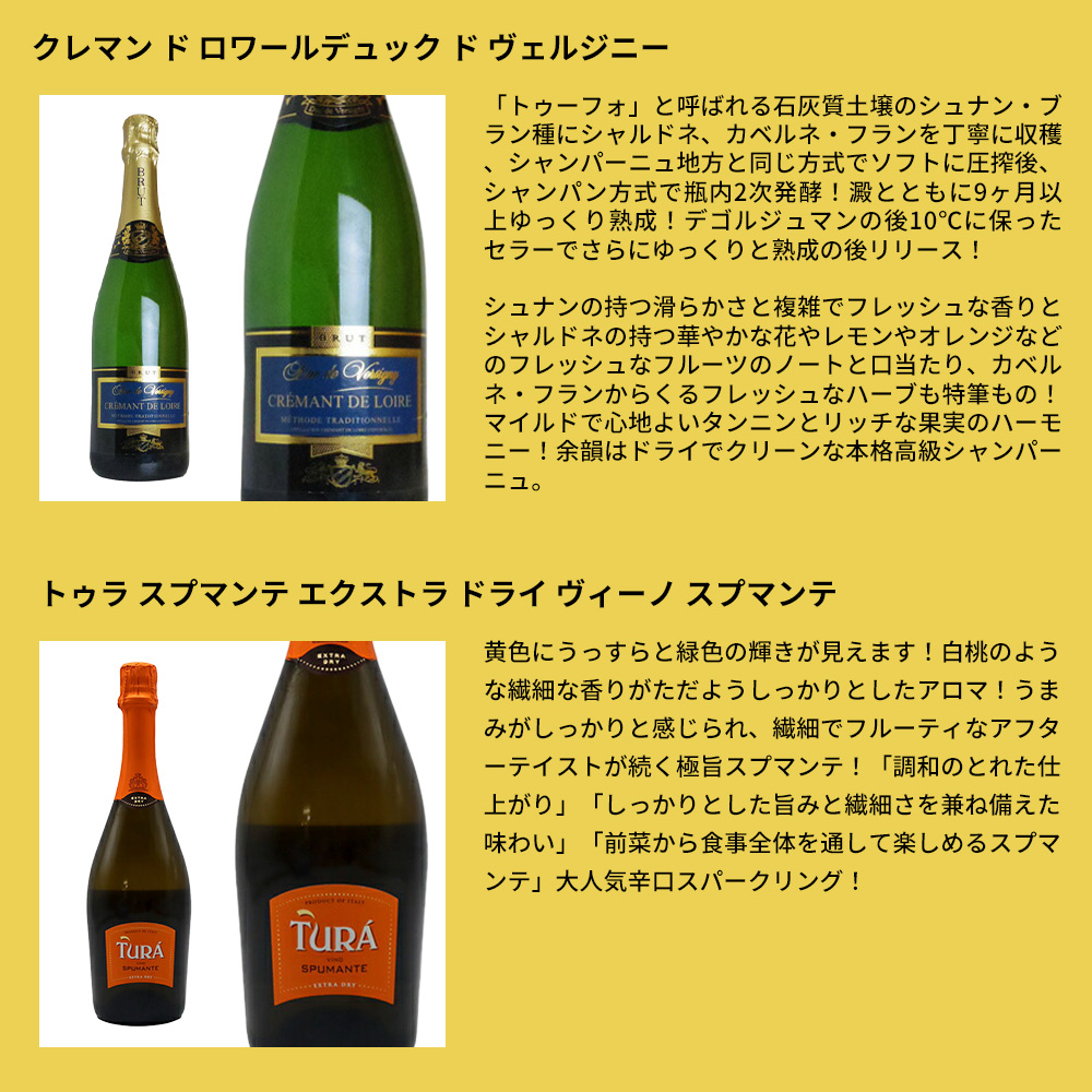【商品説明】遂に最強スパークリングセット!第1弾販売開始!このスペシャル豪華泡セットで泡三昧!玉手箱厳選の高級辛口スパークリング9本セット!玉手箱のスパークリングセットは中身で勝負!絶対に妥協はしません! 高級クレマン(シャンパン製法)が1本!さらに高級カヴァ(シャンパン製法)2本を含む銘醸三大産地入り(フランス、イタリア、スペイン)の高級スパークリング飲み比べセット!高級クレマン&カヴァが入って1本当たり驚愕776円(税別)で味わえる! 中身は、歴史ある造り手、カーヴ・ド・エリザベスがフランス・ロワールで造る究極辛口クレマン・ド・ロワール(高級シャンパン方式(瓶内二次発酵))が1本!さらにこれまたスペイン高級スパークリングの代名詞こだわりの高級カヴァ(高級シャンパン方式(瓶内二次発酵))が計2本!さらにイタリアの大人気スプマンテやコスパ抜群のスパークリング等、豪華計9本! しかもスパークリングファンに大人気の全て辛口!お買い得スパークリングセットは楽天内でも販売されておりますが、玉手箱はランク上の辛口スパークリングを詰め込みます!このスペシャル内容で1本あたり驚愕776円(税別)!しかも送料無料でお届けします!当店単品合計販売価格9,760円(税抜)+送料590円=10,350円のところ3,370円引きの驚愕6,980円(税抜)! 高級クレマンに高級カヴァが入ってまさに限界価格のスペシャルプライス!普段飲みに!パーティーで!大活躍間違いなしの豪華スペシャル泡9本セット!このセットで泡三昧してください!残り3本まで送料無料のまま同梱可能!