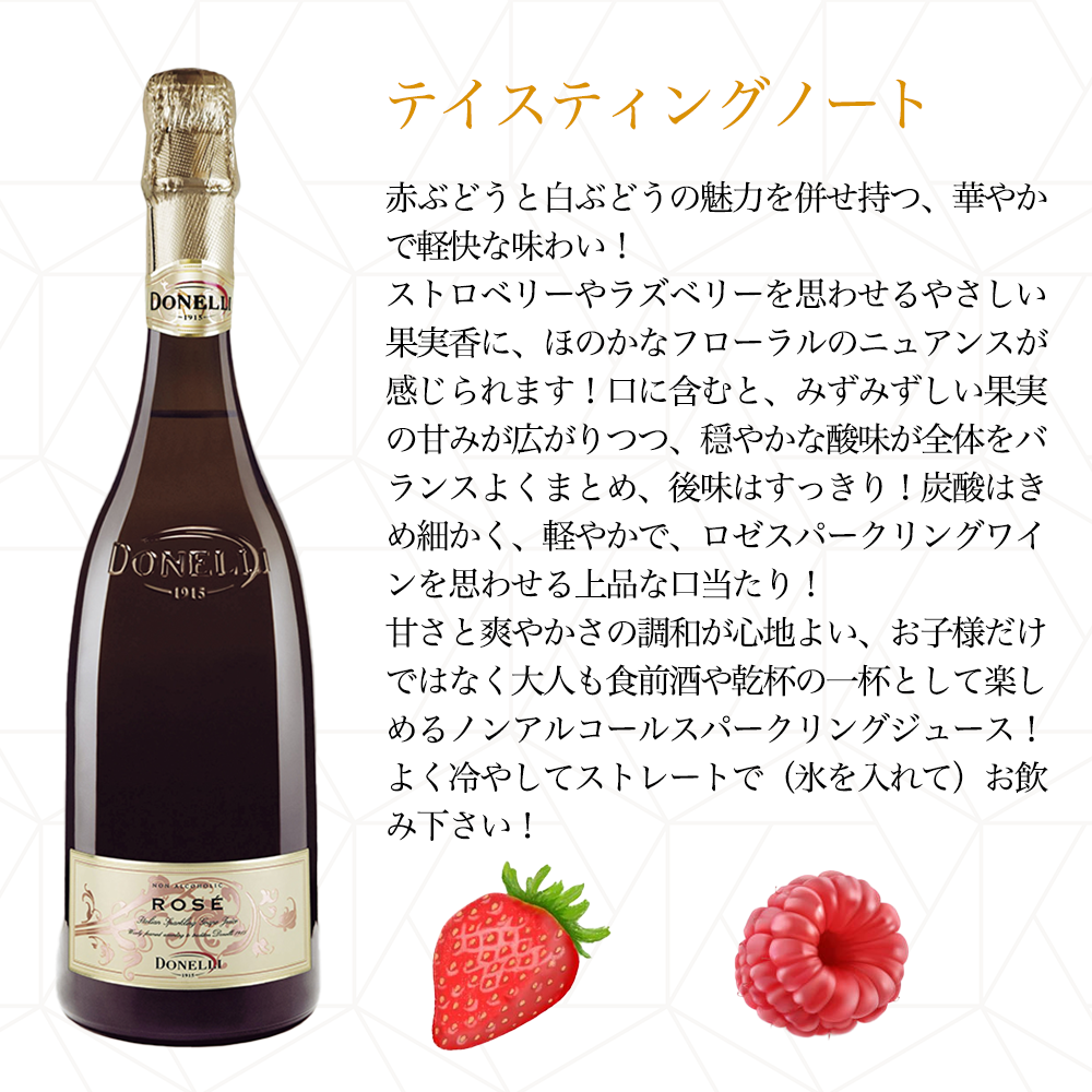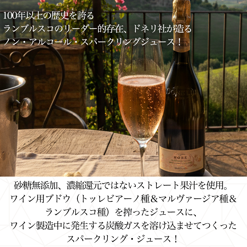 【商品説明】今、爆発大人気!ブドウジュース(ノンアルコール)愛好家大注目! 100年以上の歴史を誇るランブルスコのリーダー的存在、ドネリ社が造るノン・アルコール・スパークリングジュース! 砂糖無添加、濃縮還元ではないストレート果汁! しかもワイン用ブドウ品種使用のスパークリング・ジュース! 造り手のドネリ社は、エミリア=ロマーニャの地酒、赤い発泡性ワイン「ランブルスコ」の名門ワイナリー! 1915年、創業者であるアドルフォ・ドネリ氏が自家消費用のワインを市場に、と決断したことから創業し、以来1世紀近く、今や彼の情熱とエミリア=ロマーニャ州という土地への愛情が込められたランブルスコは、爽やかなスパークリングワインとして世界中で愛されています!現在は、家族経営のランブルスコの造り手の中では最大のグループとして知られています! また、特徴あるこのボトルは、フェラーリ創設期に活躍し、数多くの魅力的な車体デザインを生み出したセルジオ・スカリエッティ氏によってデザインされました! この「ノンアルコール・ドネリ・グレープ・ローズ・スパークリングジュース(スカリエッティボトル)」はイタリア・エミリア・ロマーニャ州のトッレビアーノ種&マルヴァージア種&ランブルスコ種使用!ワイン用ブドウ品種を使用し、ワインの醸造中に発生する炭酸ガスを溶け込ませ作ったスパークリングジュース! 砂糖無添加、濃縮還元ではないストレート果汁を使用! 赤ぶどうと白ぶどうの魅力を併せ持つ、華やかで軽快な味わい!ストロベリーやラズベリーを思わせるやさしい果実香に、ほのかなフローラルのニュアンスが感じられます!口に含むと、みずみずしい果実の甘みが広がりつつ、穏やかな酸味が全体をバランスよくまとめ、後味はすっきり!炭酸はきめ細かく、軽やかで、ロゼスパークリングワインを思わせる上品な口当たり! 甘さと爽やかさの調和が心地よい、お子様だけではなく大人も食前酒や乾杯の一杯として楽しめるノンアルコールスパークリングジュース! よく冷やしてストレートで(氷を入れて)お飲み下さい!