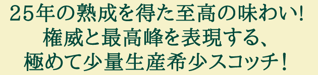 | ■ウイスキーについて | 極上のシングルモルト!!今や世界中に知れわたっているグレンリヴェット!最低でも25年を経たもので最もレアなものを使って、シェリー-の空き樽で仕上げるバッチ製造のグレンリヴェット25年!!限定入荷!!鮮やかな琥珀カラー!!ダークチョコレート・スルタナのアロマ!!シルキーな甘さにシナモンのニュアンス!!余韻は信じられないほど長く、リッチで、最高のバランスを生み出している!!究極シングルモルト!!至福の時間をぜひお楽しみください!! |