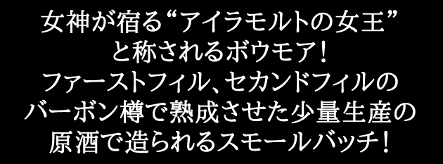 1779年、アイラ島の浜辺に誕生したボウモア蒸留所。以来、200有余年、手間がかかる製法を決して変えない職人たちが黙々と仕事を続けています。その昔、この荒涼たる孤島でのウイスキー造りは輸送が大変でした。しかし、島の男たちが磨き上げてきた伝統の技の納品には、それだけの確かな個性がありました。早くも18世紀にはボウモア村のウイスキーは「豊かで洗練された品質」というキャッチフレーズとともに英国全土に知れ渡っていたのです。
