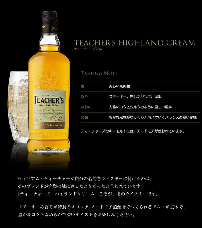 ![]() ティーチャーズ ハイランドクリーム美しい茶褐色。スモーキー。熟したリンゴ、洋梨の香り。味わいは力強いコクとシルクのように優しい風味。豊かな風味がゆっくりと消えていくバランスの良い後味。ティーチャーズのキーモルトには、アードモアが使われています。 |