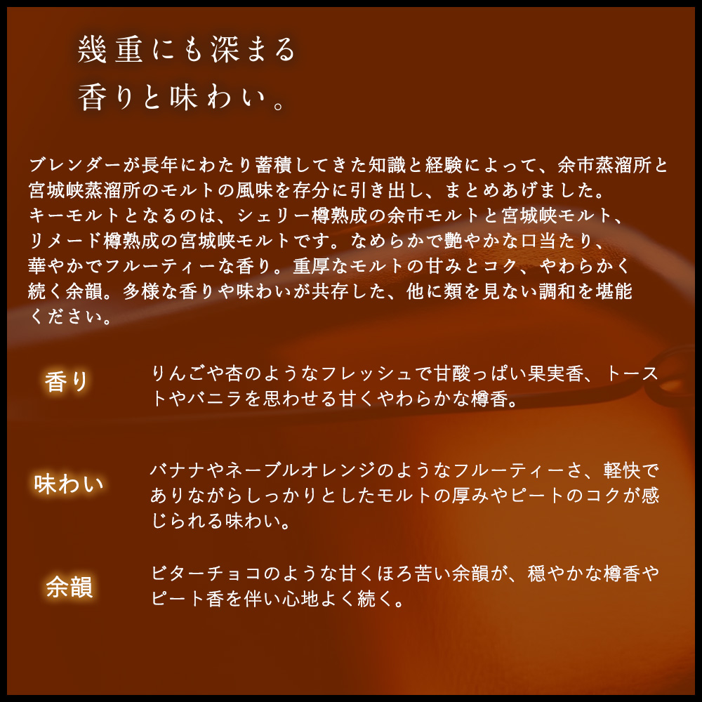 【商品説明】磨きぬかれた調和、まさにアート!!極限までなめらかに美しく仕上げる、ブレンドの技!!日本のウイスキーの父、竹鶴政孝の名を冠したピュアモルト“竹鶴”のリニューアル品!!竹鶴ピュアモルトの特徴である“香り豊かで飲みやすいピュアモルトウイスキー”という特徴は受け継ぎながら、現行の竹鶴ピュアモルトに比べてより宮城峡モルトと余市モルト、両蒸溜所の特徴が感じられる味わいにクオリティアップ!!口に含んでいただくと、宮城峡モルトの個性である甘くやわらかな香りと華やかさがまず感じられ、その後に余市モルトの特徴であるモルトのコクとしっかりした味わい、香ばしいピートの余韻が感じられます!!現行の竹鶴ピュアモルト、及びこの度発売する新竹鶴ピュアルモルトも宮城峡モルトがベースになっておりますが、新竹鶴ピュアモルトではより両蒸溜所の個性を際立たせるため、余市モルトの比率を上げております!!具体的には、ふくらみ、厚みをもたらす余市のシェリー樽原酒と、これまでよりも豊かな香り、味わいを醸す余市のピート原酒を採用!!ニッカが誇る上質なモルトをバランスよく重ねあわせた、香り豊かで飲みやすいピュアモルトウイスキー!!甘くやわらかな香りと果実を思わせる華やかな香りの調和!!ふくらみのあるモルトのコク!!穏やかな樽香やピート香を伴う、甘くほろ苦い余韻が特徴の究極国産ウイスキー!!ぜひご賞味ください!!