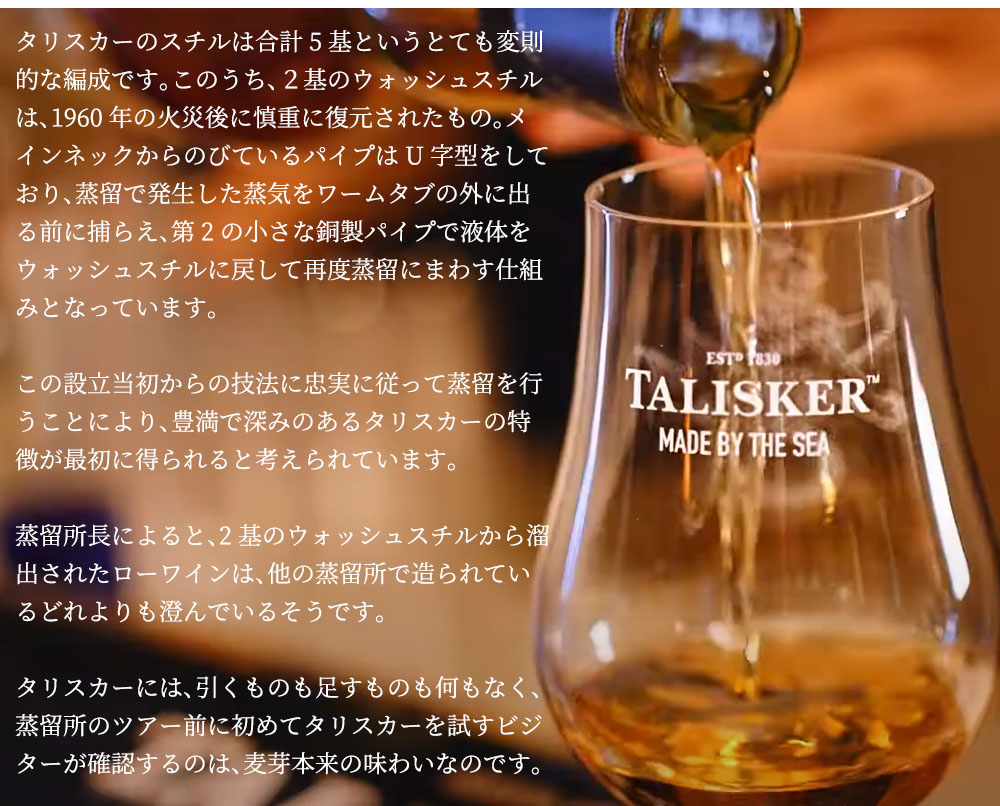 ![]() タリスカーの生みの親であるヒューとケネスのマカスキル兄弟がスカイ島にやってきたのは1827年。少し南に下ったエッグ島出身でスカイ島に羊を運ぶ仕事をしていました。移住した後、この地で生産される大麦をより大きな価値を生み出すものにしようと、当時スコットランドで盛んに生産されるようになったウイスキーをスカイ島でも造る決意を固めます。兄弟はロッホ・ハーポートという汽水湖の沿岸に面したカーボストに蒸留所を構え、「タリスカー蒸留所」が誕生します。タリスカーの名は、兄弟が蒸留所建設中に滞在した「タリスカー・ハウス」にちなみ名付けられたといわれ、古代ノース語(バイキングの言葉)で“Thalas Gair(傾いた大岩)”という意味があります。 ![]() 当時ウイスキー蒸留所のほとんどが農場の副業として運営され、スカイ島でも免許を持つ7つの蒸留所と、数十の無免許蒸留所が稼動していました。カーボストは羊を飼うためという名目で借りることができた土地だったため地元からの反対に遭いましたが、マカスキル兄弟のウイスキー造りへの情熱と信念により、1830年に念願の蒸留所を開業。1840年代になるとアイルランド発のじゃがいも飢饉の余波がスコットランドに広がり、スカイ島でもタリスカー蒸留所が、地元の人々の救済に奮闘しました。その最中の1843年、資金繰りに行き詰まり、北スコットランド銀行のマネジャーであったジャック・ウエストランドに蒸留所を売却。その後、いくつかのオーナーの変遷を経て、1925年に現在の形に落ち着きました。 ![]() 1920年~40年代にかけて、大恐慌や第2次世界大戦により、スカイ島の他の蒸留所は撤退を余儀なくされ、タリスカー蒸留所にも不遇の時代が訪れます。また、1960年には、蒸留所で火災が発生し、戦後最大の危機に見舞われましたが、当時のスタッフの再興に向けての情熱と不屈の努力により、蒸留所は2年後に復活。創業者であるマカスキル兄弟の熱い情熱と信念は、時を越えて受け継がれ、ロッホ・ハーポートの海に面したタリスカー蒸留所は、今なお全世界に向けてタリスカーを造り続けています。 ![]() 発酵は昔ながらのオレゴンパイン(オレゴン松)製のウォッシュバック(発酵槽)で行い、乳酸菌による乳酸発酵を促します。発酵時間も通常50時間程度のところをタリスカー蒸留所では70時間かけて発酵。これが、独特のフルーティーな香りと味わいを生み出します。 |