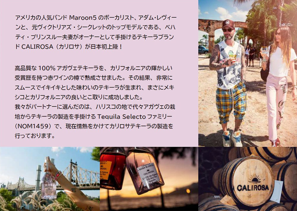![]() 【正規品】カリロサ アネホ テキーラ 100%アガベ 750ml 40% ■アルコール度数:40% ■内容量:750ml 日本初上陸!!超限定テキーラ!! アメリカの人気バンド“Maroon5(マルーン5)”のボーカリスト、アダム・レヴィーンと、元ヴィクトリアズ・シークレットのトップモデルである、ベハティ・プリンスルー夫妻がオーナーとして手掛けるテキーラブランド!!CALIROSA(カリロサ)!!が日本初上陸!!カリロサは伝統的なテキーラのメキシカンスピリッツと、カリフォルニアスタイルの融合により完成!! 我々がパートナーに選んだのは、ハリスコの地で代々アガヴェの栽培からテキーラの製造を手掛けるTequila Selectoファミリー(NOM1459)で、現在情熱をかけてカリロサテキーラの製造を行っております!!そんなカリロサより2 回蒸留後、カリフォルニア赤ワインの中古樽で18ヵ月間熟成させて造り上げられた!!アネホ!!この工程により、独特のバニラ、キャラメル、ナツメグ、チョコレー トのノートを醸し出し、芳醇でまろやかな味わいにトッフィーやシナモンを感じます!! ぜひ一度、ご賞味ください!! |