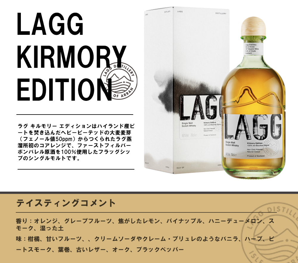 【商品名】【正規品 箱入】ラグ キルモリー エディション シングル モルト スコッチ ウイスキー ノンチルフィルター・ナチュラルカラー 700ml 46% 【英名】LAGG KIRMORY EDITION SINGLE MALT SCOTCH WHISKY NON CHILL FILTERD NATURAL COLOUR 700ml 46%【商品説明】アラン島北部に“ロックランザ蒸溜所(旧名アラン蒸溜所)”を所有するIsle of Arran Distillers社が、2019年に同島南部に設立した蒸溜所!!ラグ蒸留所!!2器(1対)の蒸溜器を使用し、豊潤で複雑、アーシーな(土っぽい)味わいのモダンで個性溢れるピーテッドタイプのシングルモルトづくりを目指しています!!またピーテッドウイスキーをつくる一方、泥炭地の保護活動にもコミットしています!!そんなラグ蒸留所よりハイランド産ピートを焚き込んだヘビーピーテッドの大麦麦芽(フェノール値50ppm)からつくられたファーストフィルバーボンバレル原酒を100%使用し、ノンチルフィルター、ノンカラーリングでボトリングしたラグ蒸溜所のフラッグシップのシングルモルト!!ラグ キルモリー エディション!!限定入荷!!キルモリーとは、ラグ村の教区に由来!!香りは甘さを伴ったピートが支配的に広がります!!オレンジやグレープフルーツ、焦がしたレモンといった柑橘系のアロマ、パイナップルやハニーデューメロンの甘いフルーツのアロマに続いて、焚き火の残り火や古いパブを思い起こさせる灰を含んだスモークが広がり、湿った土のニュアンスも感じられます。味わいも香りと同じく柑橘や甘いフルーツ、バニラ、ハーブが感じられ、徐々に灰の混ざった土っぽいピートスモーク、葉巻、古いレザー、オークへと変化します!!スモークはフィニッシュまで続き、ブラックペッパーがアクセントに加わります!!ぜひこの機会にご賞味ください!! 【ワインのタイプ】 【ワインのテイスト】 【生産者】ラグ蒸留所 【生産地】イギリス/スコットランド 【生産年】 【内容量】700ml 【ブドウの品種/セパージュ アッサンブラージュ】 【注意文】 【商品番号】9903000024933