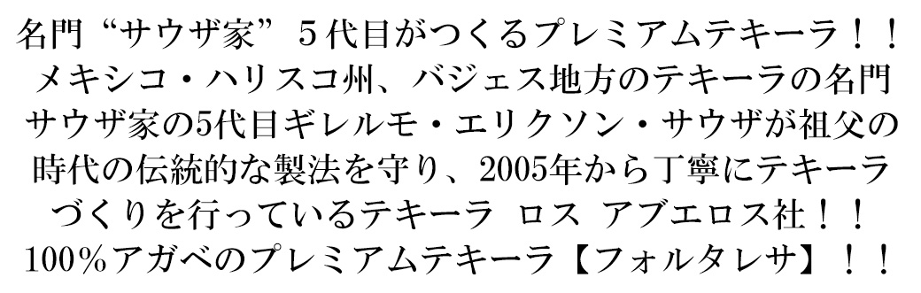 【テキーラ ロス アブエロス社:フォルタレサ蒸溜所は、元々サウザ家が所有していた3つの蒸溜所のうちの1つで、1968年に閉鎖。サウザ家5代目のギレルモは、1999年にこの蒸溜所の再建に踏み切り、2005年に100%アガベのプレミアムテキーラ「フォルタレサ」をリリース。時間が短縮できる近代的な製法ではなく、100年以上もの間、受け継がれてきた伝統的で手間の掛かる製法でつくられた「フォルタレサ」は、今や世界中から注目の集まるプレミアムテキーラとなり、世界106のバーが選ぶドリンクス・インターナショナルの「ANNUAL BRANDS REPORT2018」では、テキーラ部門でTOP10に選ばれています。