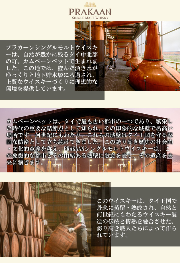 【商品説明】タイ王国!!初のシングルモルトウイスキー!!を生み出しているプラカーン蒸留所!!プラカーンシングルモルトウイスキーは自然が豊かに残るタイ中北部の町、カムペーンペットで生まれました!!この地では、澄んだ湧き水がゆっくりと地下貯水層にろ過され、上質なウイスキーづくりに理想的な環境を提供しています!!カムペーンペットは、タイで最も古い都市の一つであり、繁栄した時代の重要な結節点として知られ、その印象的な城壁で名高い場所です!!何世紀にもわたり、これらの城壁はタイ王国を守る堅固な防衛として立ち続けてきました!!プラカーンシングルモルトウイスキーは、この誇り高き歴史の社会的・文化的意義を称え、PRAKAANシングルモルトウイスキーはこの象徴的な都市とその由緒ある城壁に敬意を表し、その遺産を未来に繋ぎます!!このウイスキーは、タイ王国で丹念に蒸留・熟成され、自然と何世紀にもわたるウイスキー製造の伝統と情熱を融合させた、誇り高き職人たちによって作られています!!そんなプラカーン蒸溜所よりバーボンカスクで熟成されたハウススタイル!!プラカーンセレクトカスク!!香りは柔らかなトロピカルフルーツと爽やかな柑橘の香りが、豊かな蜂蜜の甘さ、クリーミーなバニラ、そしてレモンケーキの心地よいニュアンスと美しく調和されています!!味わいはカラメルされたパイナップルスライスと柔らかなトフィーの甘さが広がり、挽きたてのスパイスの豊かな香りとキャンディーのようなレモンピールの風味が絶妙に調和しています!!余韻は成熟した深みがあり、熟したフルーツの風味が長く持続します!!