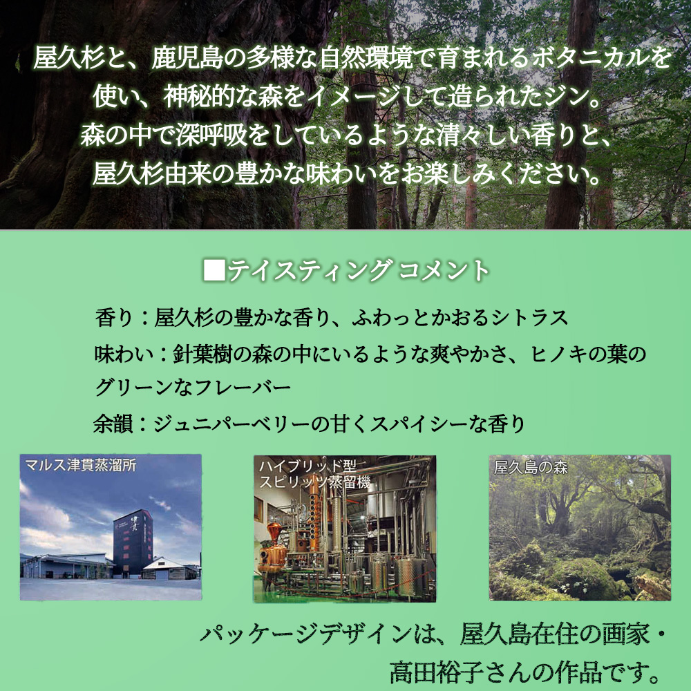 【商品説明】鹿児島の多様な自然環境で育まれるボタニカルを取り入れたジャパニーズ・ジン“Japanese GIN 和美人”!!の屋久杉と、鹿児島の多様な自然環境で育まれるボタニカルを使い、神秘的な森をイメージして造られたジャパニーズ・ジン!!Japanese GIN 和美人The Forest!!ジュニパーベリーと屋久杉を中心に、蒸溜所のある津貫で採取されたヒノキの葉、9つの鹿児島県産ボタニカルを使い、針葉樹の爽やかな香りを表現!!森の中で深呼吸をしているような清々しい香りと、屋久杉由来の豊かな味わい!!パッケージデザインは、屋久島在住の画家・高田裕子さんの作品です!!