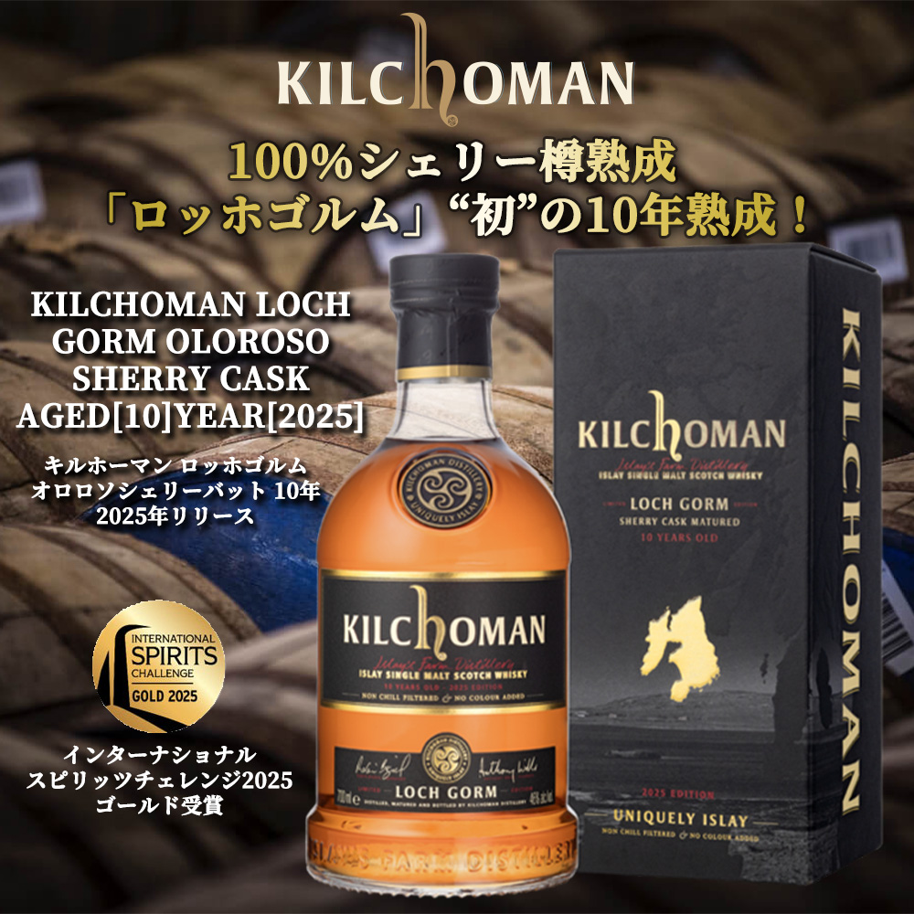 【商品説明】100%シェリー樽で熟成年1回の限定品!!ロッホゴルム初の10年熟成品!!スコットランド最西の19世紀のアイラ島では一般的であったファームディスティラリー(農場蒸留所)で使用するモルトの一部を自社の畑で栽培している創業2005年!! アイラ島に124年ぶりに誕生したキルホーマン蒸留所!!よりアイラ島のピートをたっぷりと焚き込んだフェノール値50ppmの麦芽を使用し、100%シェリー樽で熟成された、年に一度だけリリースされる限定品!! キルホーマン ロッホゴルム!!ロッホゴルムとは蒸溜所近くの湖の名称で、ピーティな性質を持つこの水を仕込み水として使用しています!!キルホーマンでは全体の約80%がバーボンバレルで熟成されているため、シェリー樽100%で仕上げられるロッホゴルムは極めて希少な存在!! 2025年リリースは、“ロッホゴルム”初となる10年熟成で、10年以上熟成されたオロロソシェリーバット原酒23樽を使用!! なんと“インターナショナルスピリッツチェレンジ2025”で“ゴールド”を受賞!! オロロソシェリーバットでの10年間の熟成によって、キルホーマン特有のシトラスがほんのり効いたスモーキーな味わいに、豊かなスパイス、ダークフルーツ、そしてバーベキューを思わせるような甘みがしっかりと加わっています!!ピートとオロロソシェリー樽の特徴が見事に融合した、年に1度のリッチな味わいをぜひこの機会にご賞味ください!!