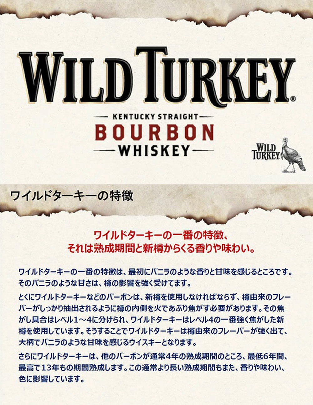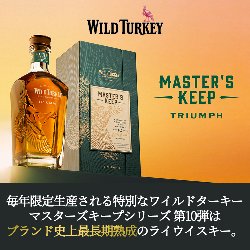 【商品説明】アメリカンウイスキー愛好家必見!!ケンタッキー州を代表するワイルドターキーの最上級品!!毎年異なるテーマを持ちスモールバッチ、数量限定で生産される超限定品!! マスターズキープシリーズ第10弾はブランド史上最長期熟成のライウイスキー!!ワイルドターキー マスターズキープ トライアンフ!! マスターディスティラー エディー・ラッセルとその息子でアソシエートブレンダーのブルースの協働で生まれた、10年熟成とワイルドターキー蒸溜所からリリースされたライの中で最長の期間を誇る、ワイルドターキースタイルのライウイスキー!! 香りはヴァニラ香、クレームブリュレ、ミントに続くリンゴ、洋ナシ、ナツメグのノート!!味わいはハチミツとクローブの甘いノートからダークチョコレート、デーツ、スパイスへ移り変わります!!余韻は穏やかでウッディなフィニッシュ!! ワイルドターキー愛好家必見の逸品です!!