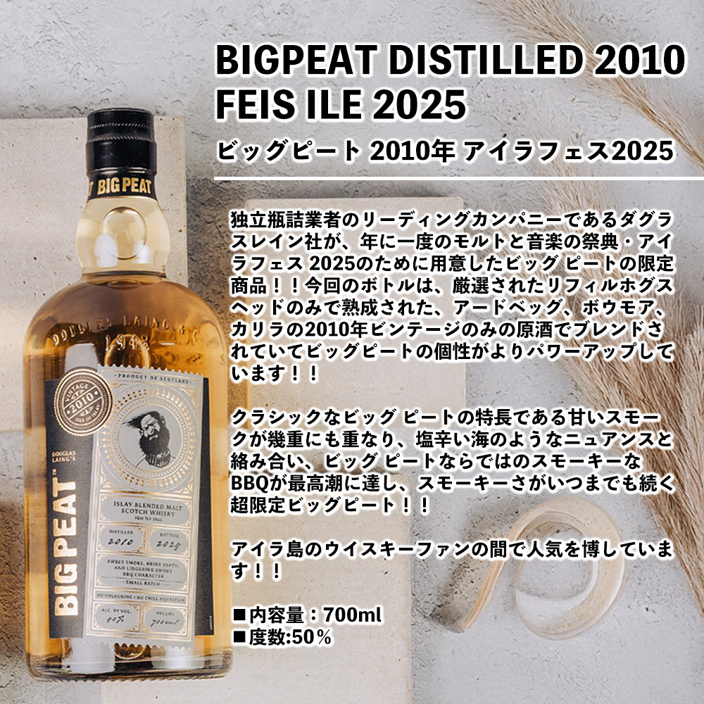 【商品説明】大人気ビッグピートのアイラフェス記念ボトル!!日本上陸!!年に一度のモルトと音楽の祭典!!アイラフェス2025!!限定ボトル!! BIG PEAT 2010 FEIS ILE 2025!!独立瓶詰業者のリーディングカンパニーであるダグラスレイン社が、年に一度のモルトと音楽の祭典・アイラフェス 2025のために用意したビッグ ピートの限定商品!! 今回のボトルは、厳選されたリフィルホグスヘッドのみで熟成された、アードベッグ、ボウモア、カリラの2010年ビンテージのみの原酒でブレンドされていてビッグピートの個性がよりパワーアップしています!! クラシックなビッグ ピートの特長である甘いスモークが幾重にも重なり、塩辛い海のようなニュアンスと絡み合い、ビッグ ピートならではのスモーキーなBBQが最高潮に達し、スモーキーさがいつまでも続く超限定ビッグピート!!アイラ島のウイスキーファンの間で人気を博しています!!