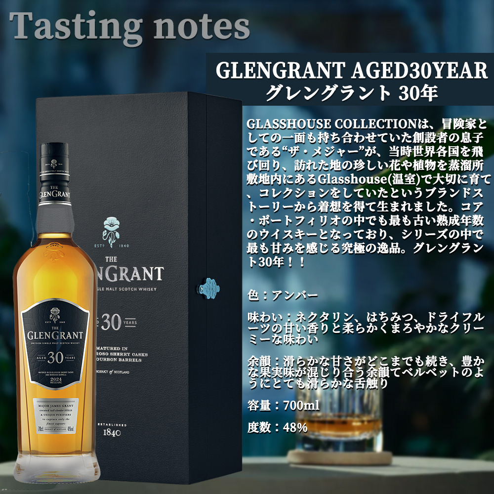 【商品説明】2024に退任した、デニスマルコムが手掛けた最後のグレングラント!! 1840年創業!!スコットランド以外で最初に販売されたウイスキー!さらにグレンフィディックに先立ち1900年にはじめてシングルモルトを売り出した蒸留所!!グレングラント蒸留所!!なんと販売量世界第6位を誇る超メジャーブランド!!グレングラントのモットーは、Simplicity“飾り気のないこと”!!新鮮で華やかなモルトフレーバーと透き通った液色、バランスに優れた銘酒が揃うスコッチを代表するスペイサイド産の大人気シングルモルトウイスキー!!ウイスキー輸入国ランキングで常に上位のイタリアにおいては、断トツのNo.1人気!!ウイスキーといえばグレングラント!!と言われる程の人気!!グレングラントのウルトラプレミアムレンジとなるGLASSHOUSE COLLECTION!!同コレクションは2023年に発売したグレングラント21年、2024年に発売したグレングラント25年、そして2025年に発売となるグレングラント30年の3種類で構成!!GLASSHOUSE COLLECTIONは、冒険家としての一面も持ち合わせていた創設者の息子である”ザ・メジャー”が、当時世界各国を飛び回り、訪れた地の珍しい花や植物を蒸溜所敷地内にあるGlasshouse(温室)で大切に育て、コレクションをしていたというブランドストーリーから着想を得て生まれました!!コア・ポートフィリオの中でも最も古い熟成年数のウイスキーとなっており、シリーズの中で最も甘みを感じる究極の逸品!! グレングラント30年!!超限定入荷!!ネクタリン、はちみつ、ドライフルーツの甘い香りと柔らかくまろやかなクリーミーな味わい!!滑らかな甘さがどこまでも続き、豊かな果実味が混じり合う余韻!!グレングラントのデリケートな酒質に深くダークな熟成感が融合した最上級グレングラント!!ぜひご賞味ください!!
