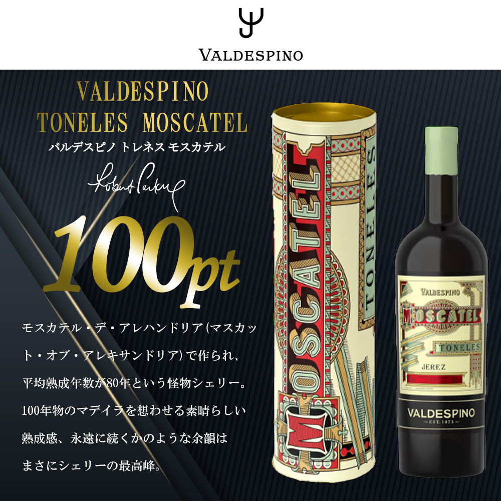 【商品説明】世界最高峰のシェリー!!マッカランの熟成に用いられている“へレスのロマネコンティ”バルデスピノ!!から世界最高峰のプレミアム&レアシェリーが超限定入荷!! 2023年にマッカランを擁するエドリントン社とバルデスピノを擁するエステベスグループは、長期的なパートナーシップを結びました!!それ以降、マッカランが熟成される樽には全て、バルデスピノが専用に手掛けたシェリーが用いられています!! いわばシングルモルトのトップブランドを支えるシェリーとなった訳ですが、その一方でワイン界において絶大なる影響力を持つ評論家ロバート・パーカーが“ワインアドヴォケイト”にて発表するポイントにおいても、バルデスピノはこれまでに満点を含む高得点を連発しています!! 同誌上において「バルデスピノをヘレスのロマネコンティと呼ぶことがある」と記されたほど、その味わいはシェリーの中でも別格です!!その中でも最高品質の希少シェリー!!世界最高峰のシェリーといっても過言ではありません!! トネレス(モスカテル)はなんと驚異のパーカーポイント100点獲得!!モスカテル・デ・アレハンドリア(マスカット・オブ・アレキサンドリア)で作られ、平均熟成年数が80年という怪物シェリー!!100年物のマデイラを想わせる素晴らしい熟成感、永遠に続くかのような余韻はまさにシェリーの最高峰!! PP100点、つまり完璧な味わいがこのボトルの中には存在しています!!