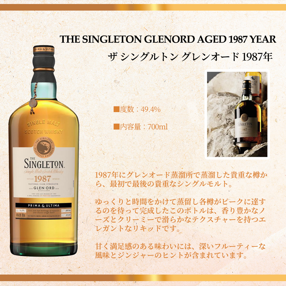 【商品説明】最初で最後の貴重なシングルモルト!! グレンオード蒸留所は、スコットランド北ハイランド地方の蒸留所で、1838年に創業したスコットランドで歴史ある蒸留所のひとつ!!グレンオード蒸留所を囲む山から流れ込む豊かな雪解けの水と雨水は、古代ゲール時代から「Water of Life」と賞賛されています!!豊かな自然の恵みと受け継がれる伝統の技術が、完璧なバランスのウィスキーを作り上げています!! そんなグレンオードの1987年にグレンオード蒸溜所で蒸溜した貴重な樽から、最初で最後の貴重なシングルモルト!!ザ シングルトン グレンオード 1987!!超限定入荷!! ゆっくりと時間をかけて蒸留し各樽がピークに達するのを待って完成したこのボトルは、香り豊かなノーズとクリーミーで滑らかなテクスチャーを持つエレガントなリキッドです!!甘く満足感のある味わいには、深いフルーティーな風味とジンジャーのヒントが含まれています!!