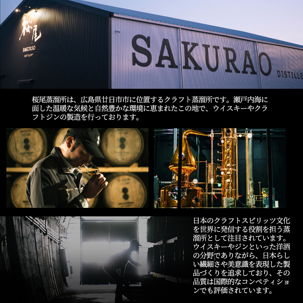 【商品説明】伝統と革新で広島から世界へ!!長い間培われてきた技術や伝統を大切に、新たなる創造に挑戦しています!! 1918年、広島県廿日市市桜尾に創業し、100年以上にわたって受け継いできた蒸留技術!!この長い歴史の歩みには、広島はもちろん、世界中の多くの方の支えやストーリーがありました!! 2017年、ウイスキー、スピリッツづくりの新たな可能性に挑戦するため“SAKURAO DISTILLERY”を設立!!長い間培われてきた技術や伝統を大切に、次の100年へと挑戦を続けています!! 海側にある桜尾貯蔵庫では夏と冬の寒暖差が大きく、潮風をまとった樽の中で熟成は早く進みます!!桜尾ジャパニーズウイスキーは創業の地・桜尾にある貯蔵庫で熟成!!モルト原酒が眠る樽は、貯蔵庫からほど近くに佇む瀬戸内海から届く潮の気配をほのかにまといます!! レーズンやオレンジ、桃の香りが広がり、バニラのような甘み、程よい渋みや酸味が感じられます!!心地良いスモーキーさと樽の香り、長く続く濃厚な甘い香りをぜひご賞味ください!!